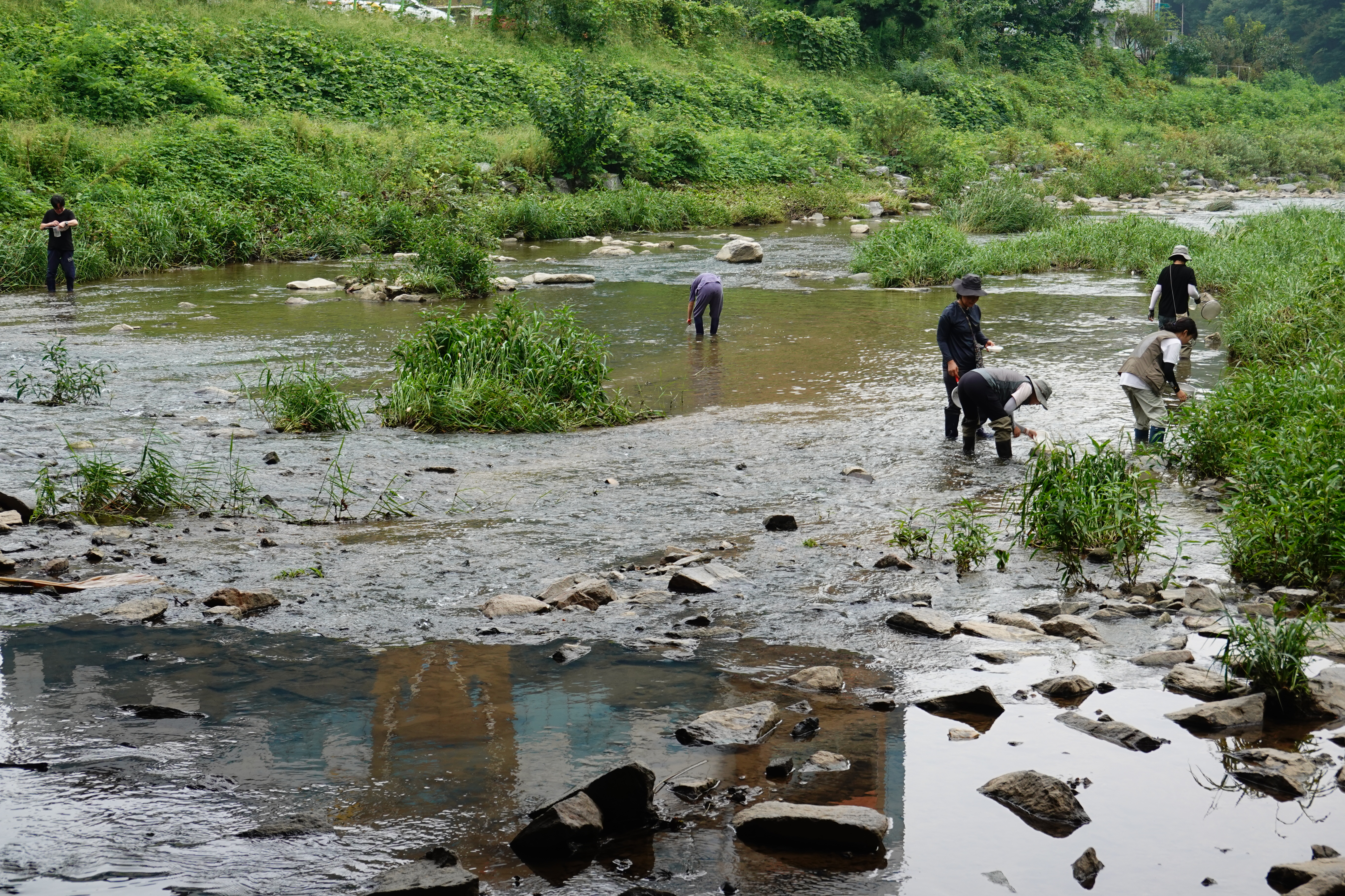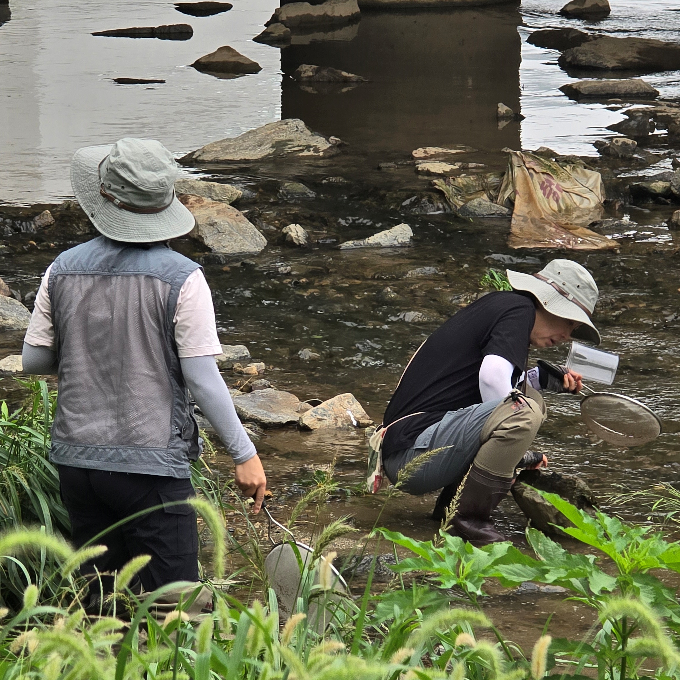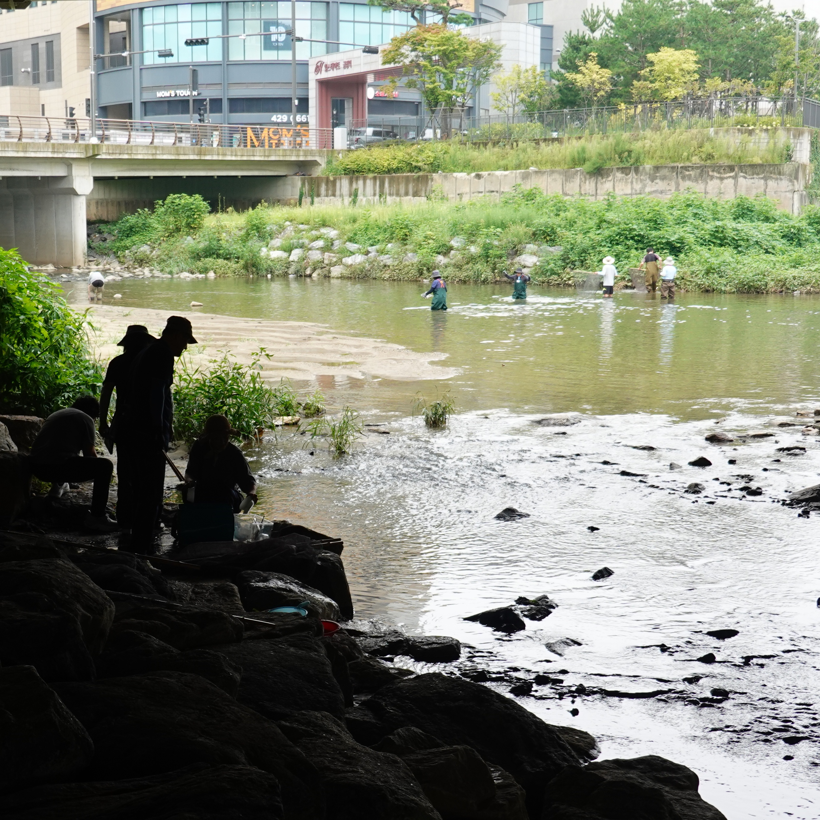 2024.08.26/ #도시기록 #사람 #군포 #산본천/ 안양천 모니터링 가던중 신본천 복원사업 추진의 일환으로 산본천 수계 모니터링을 하는 그룹을 만나다. 이들은 군포지속협, 안양군포의왕환경련, 산본천사, 자연과함께하는사람들 회원들이다. 반가운 얼굴들이 하천에서 물고기와 수생 곤충 채집을 하느라 분주하다.