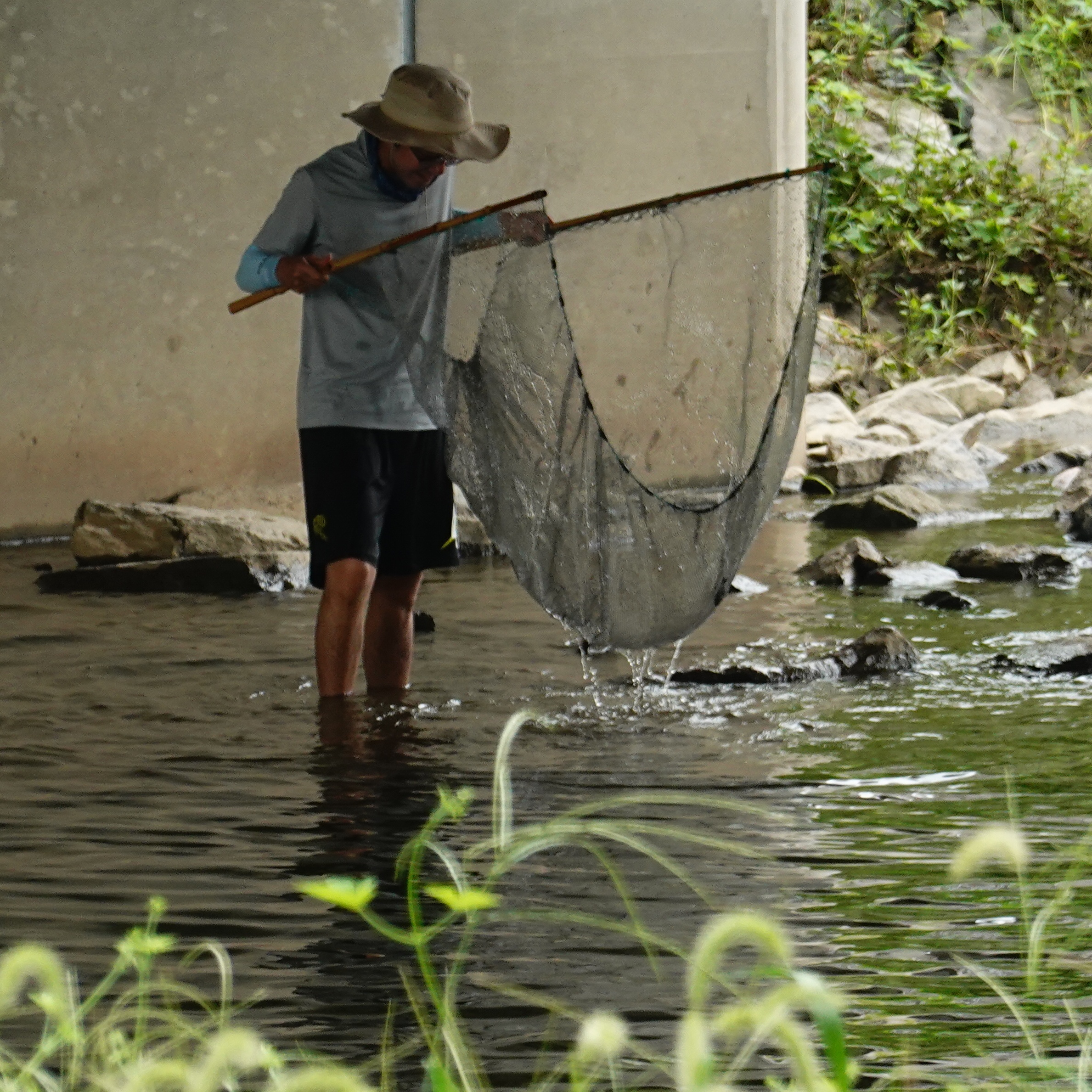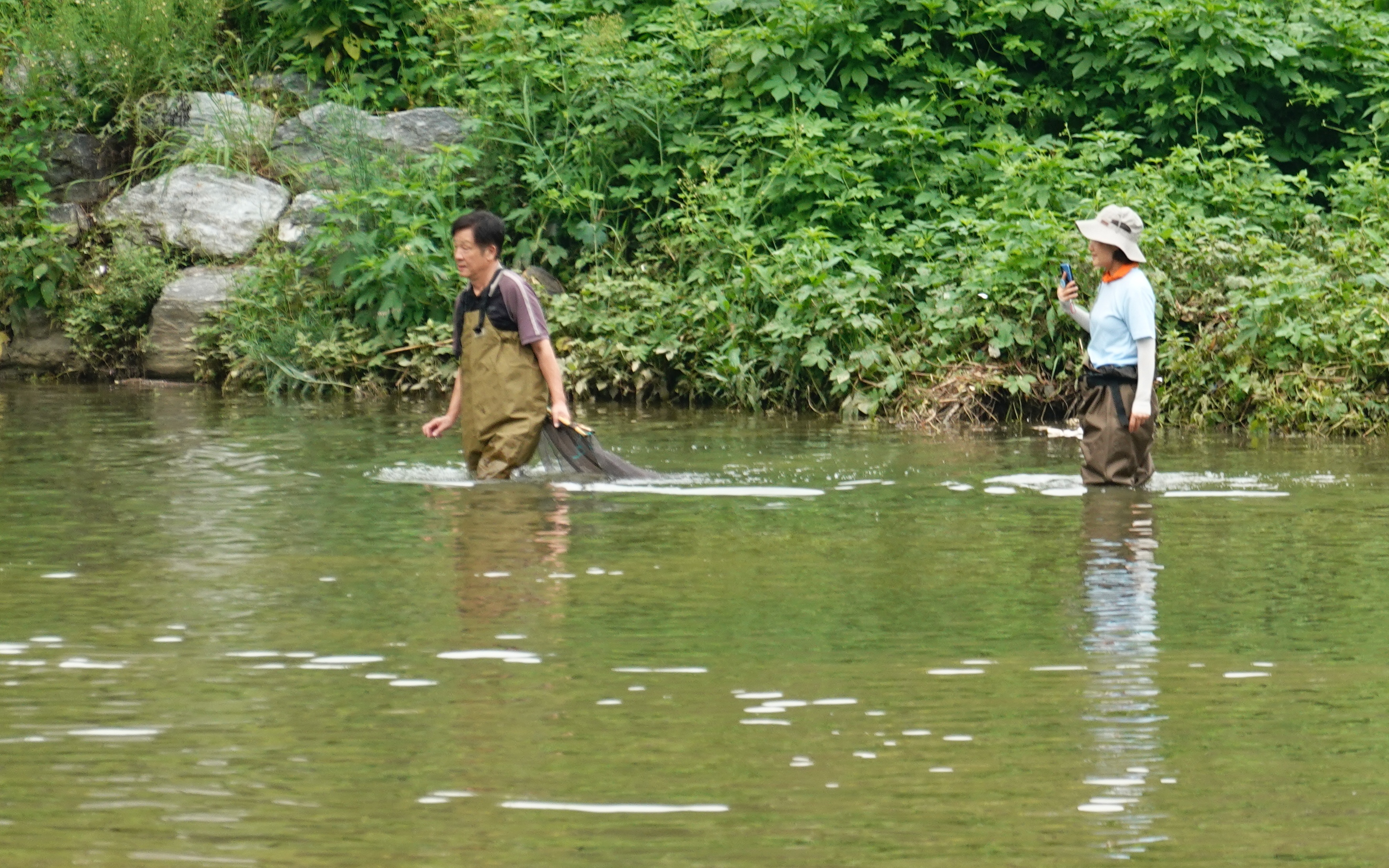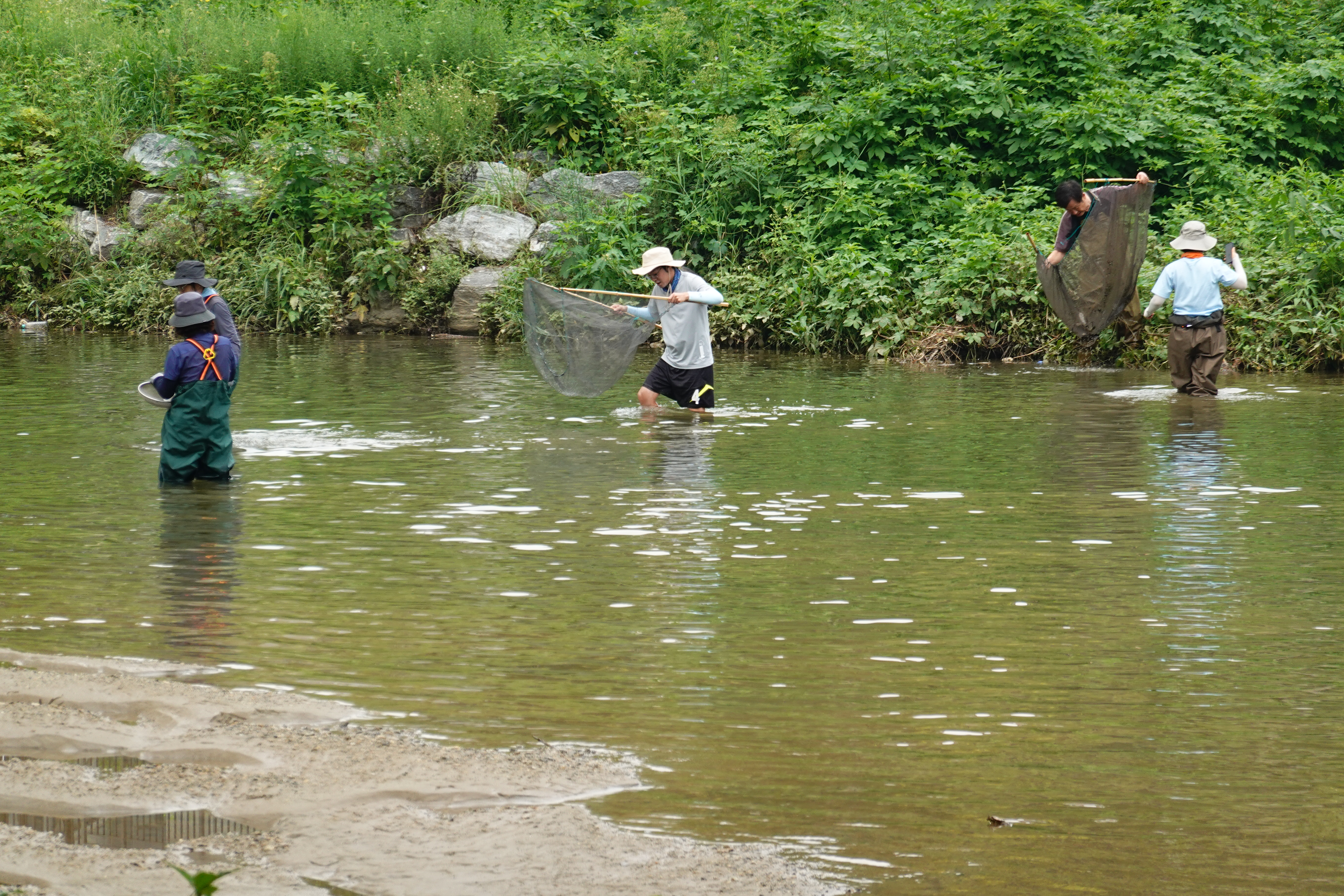 2024.08.26/ #도시기록 #사람 #군포 #산본천/ 안양천 모니터링 가던중 신본천 복원사업 추진의 일환으로 산본천 수계 모니터링을 하는 그룹을 만나다. 이들은 군포지속협, 안양군포의왕환경련, 산본천사, 자연과함께하는사람들 회원들이다. 반가운 얼굴들이 하천에서 물고기와 수생 곤충 채집을 하느라 분주하다.