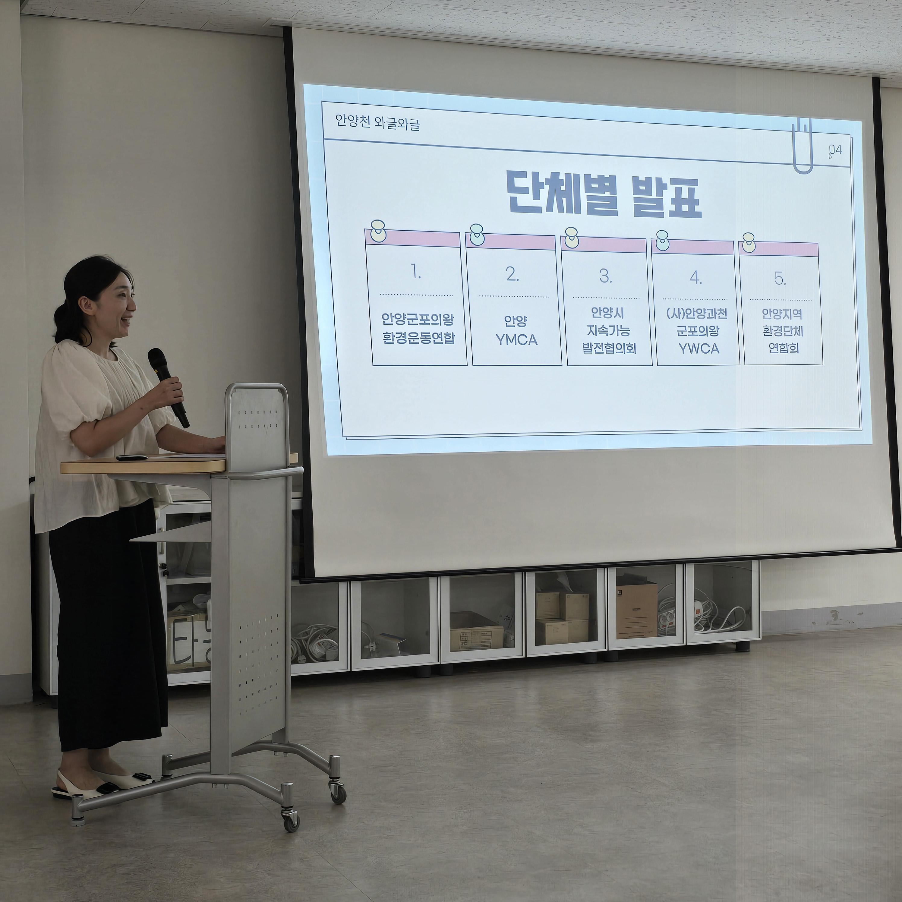 한편 안양YMCA, 안양과천군포의왕YWCA, 안양군포의왕환경운동연합.안양시지속가능발전협의회, 안양지역환경단체연합회 등 5개단체는 지난 2013년부터 안양천 본류 구간(명학대교~구군포교)과 5개 지천(삼성천,삼막천,학의천,수암천,삼봉천)을 단체별로 맡아서 모니터링 해오고 있다..