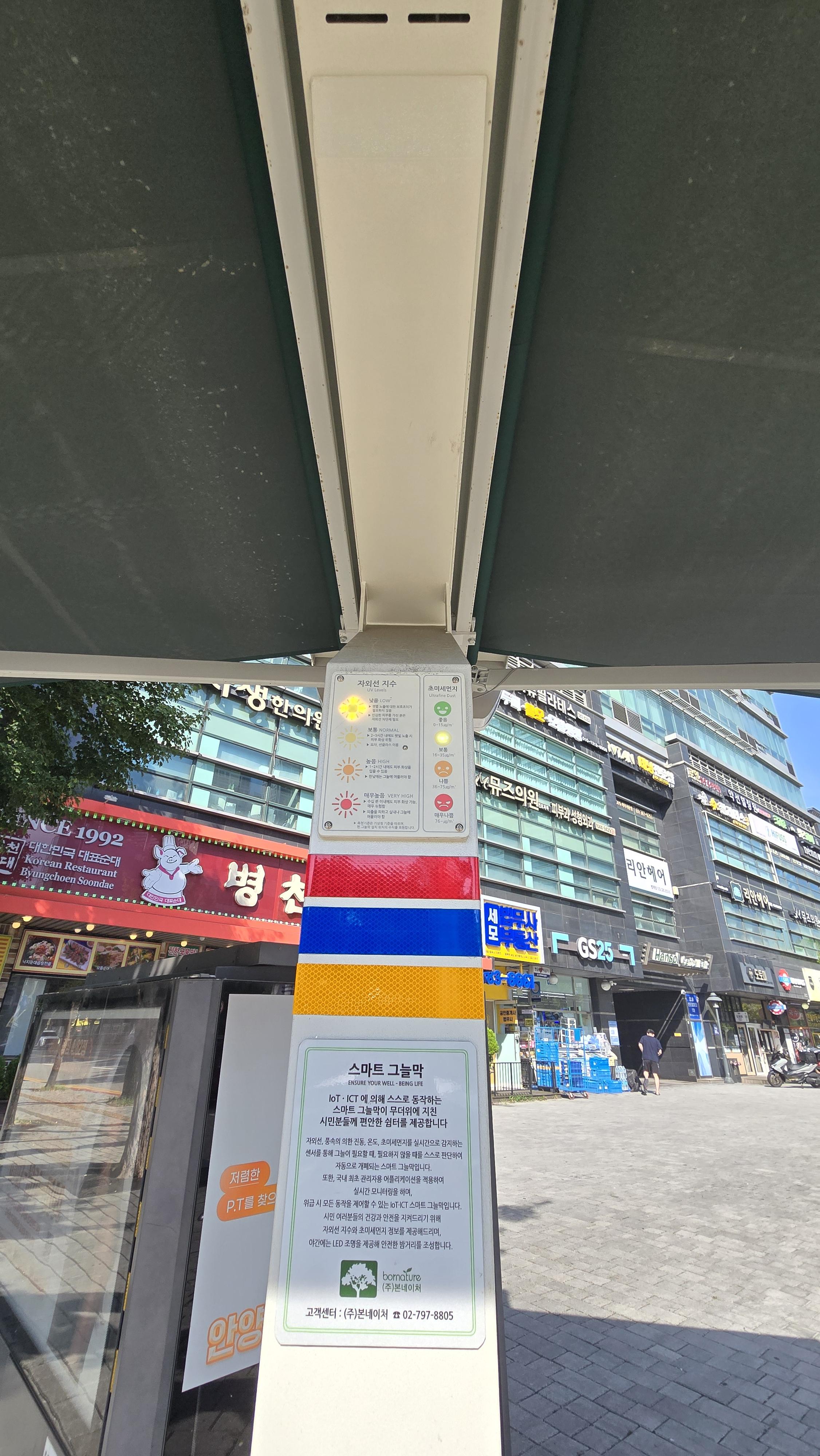 2024.08.31/ #도시기록 #안양 #그늘막 #경기도/ 안양 도심에 새로운 형태의 그늘막이 설치됐다. 이름하여 스마트그늘막. 경기도는 올해 유동 인구가 많은 주요 횡단보도, 버스정류장 등에 설치한것인데 외부 풍속과 온도를 감지해 자동으로 펼쳐진다고 한다. 경기도 자료에 따르면 현재 도내에는 고정형 1만37개, 스마트형 1,297개 등 총 1만1,334개의 그늘막이 설치돼 있으며 버스정류장 스마트쉼터는 150개소가 있다. 도는 1,343개소에 폭염저감시설을 추가로 설치할 계획이다.