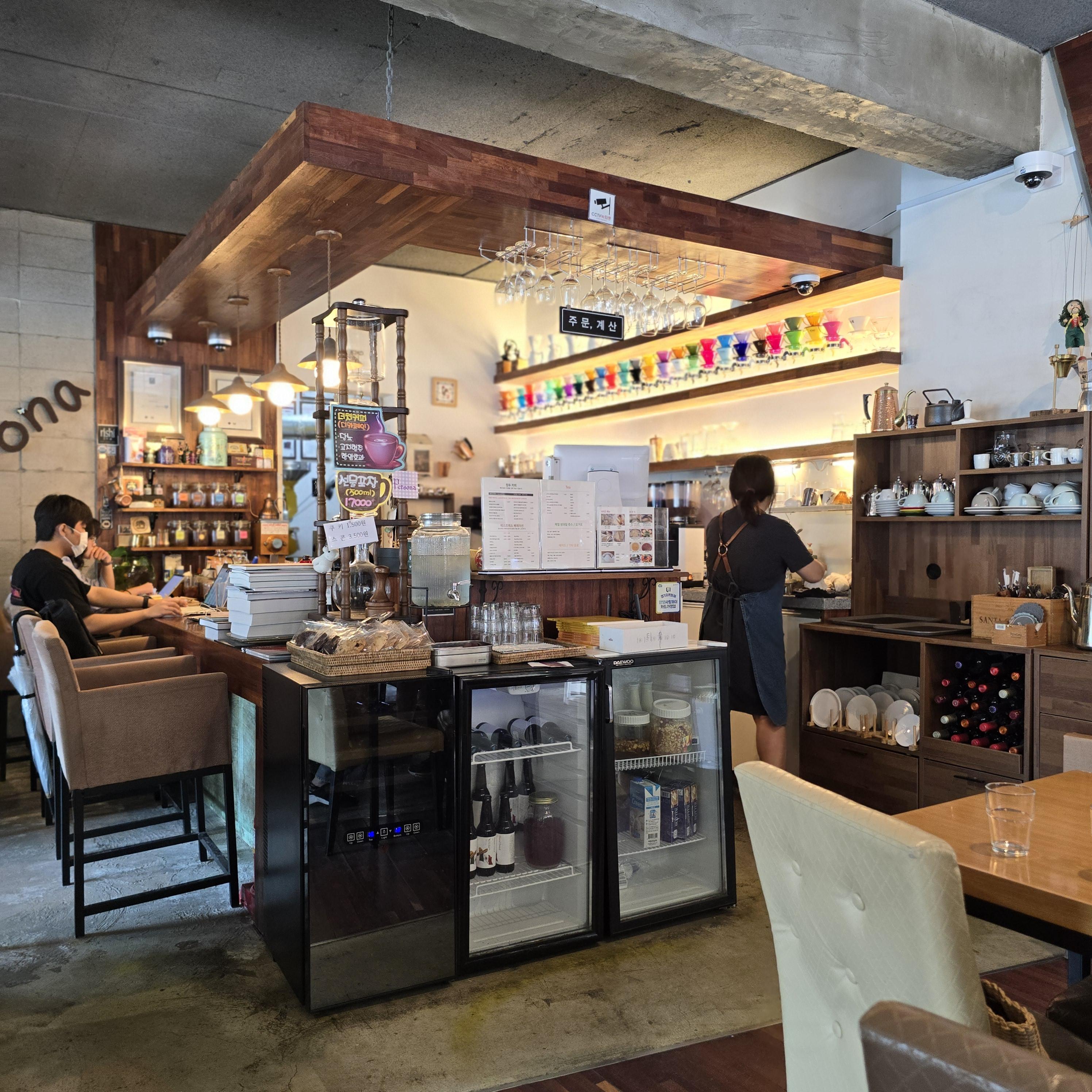 이집은 드립커피의 성지로 불리우는데 주인장(여성)이 미국, 유럽 커피 자격증에다 도자기 작가(도예가)이자 사진도 찍는 작가랍니다. 커피잔도 직접 구은 도자기. 아 그리고 ‘커피를 직접 뽑는 집’ 답게 상내에는 자양한 전세계의 원두가 잔뜩 쌓여있고, 홀 한쪽에는 원두를 볶는 큼지막한 로스팅 기계도 있고, 바리스타 교육도 하고 있지요.