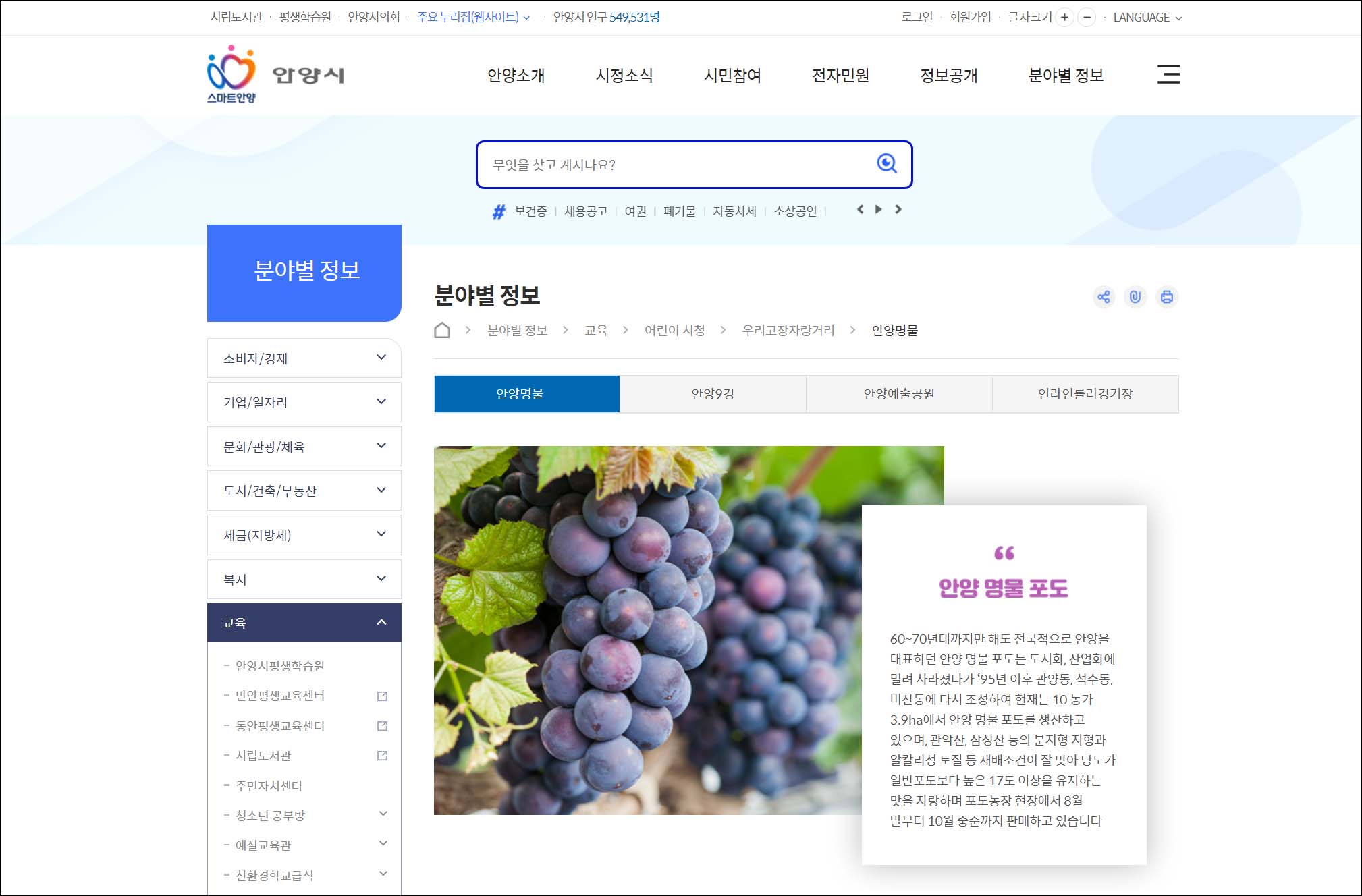 더욱이 2000년대 초 안양시가 국립농산물품질관리원에 의뢰하여 재배농가의 토양과 수질, 당도 측정 등 까다로운 검사를 실시한 결과 '품질인증'을 받을 정도로 안양포도는 많은 세월이 지났어도 과거의 명성을 유지하고 있는 우수 품종들이다.