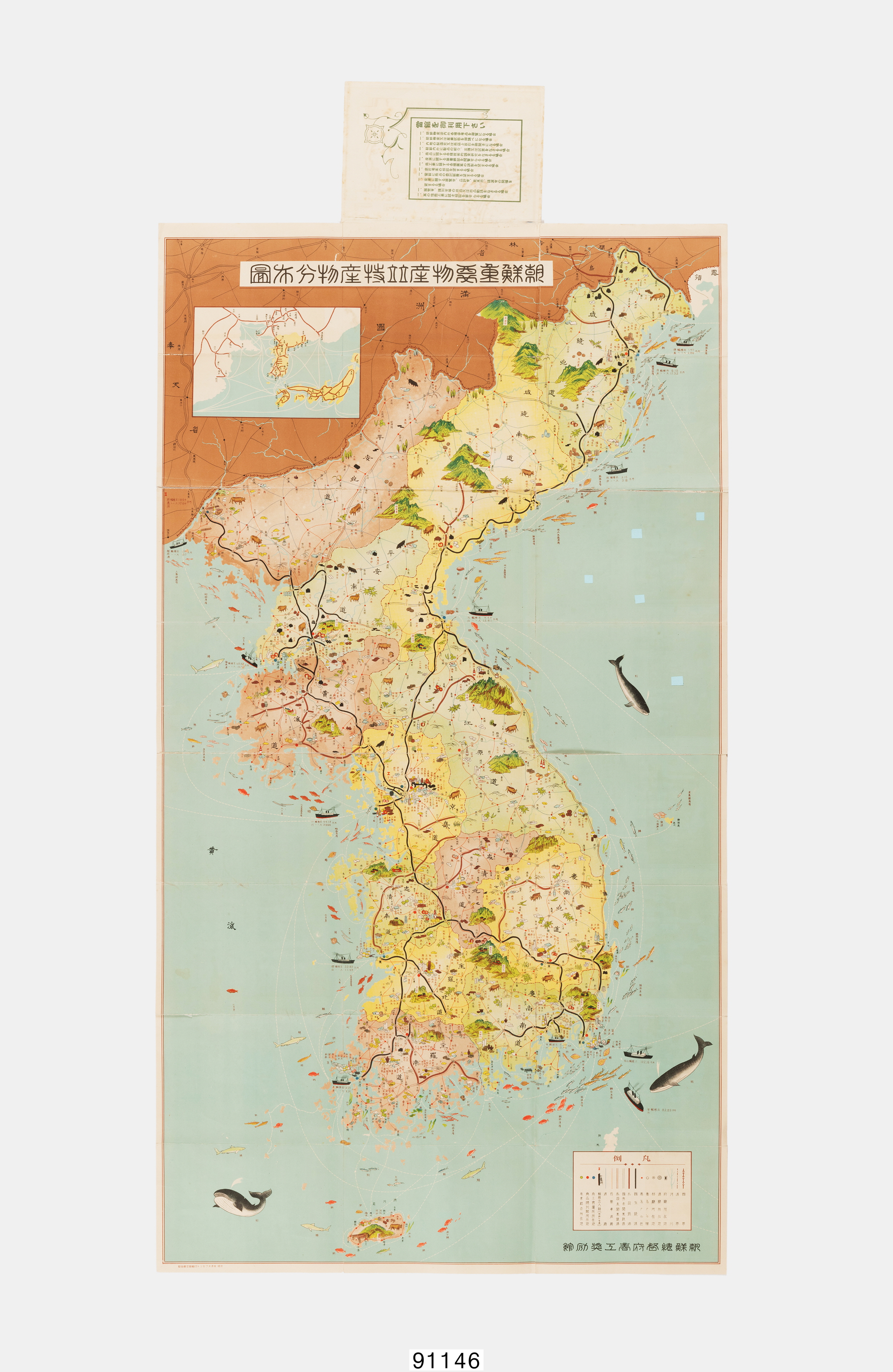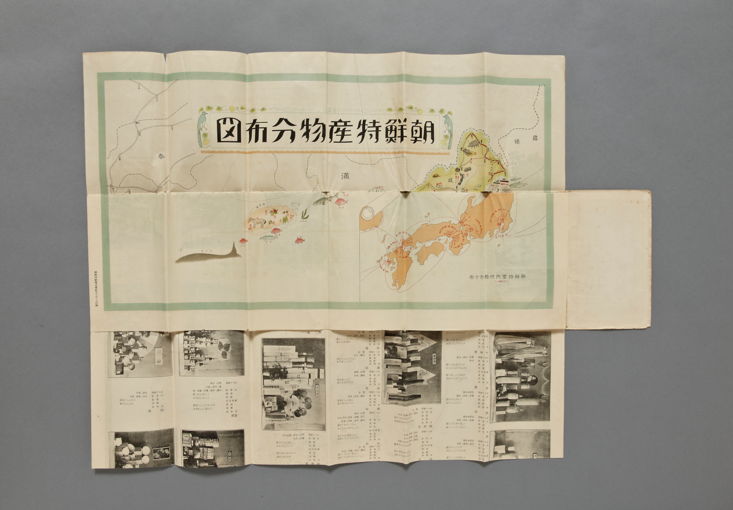 1931년 조선총독부 상공장려관에서 제작한 조선중요물산병특산물분포도(朝鮮重要物産並特産物分布圖) 지도. 조선의 지역별주요 특산물과 생산물을 그림으로 도식하고 있는 현황지도로 1930년대 지역별 특산물과 해역별 주요 어종자원을 도식하고 주요 도시들의 수출입 무역액도 적혀 있다. 친근하게 느껴지도록 특산물의 그림을 그려 넣어서 당시 지역별 주요 생산물을 누 구나 쉽게 알 수 있도록 해놓았다.