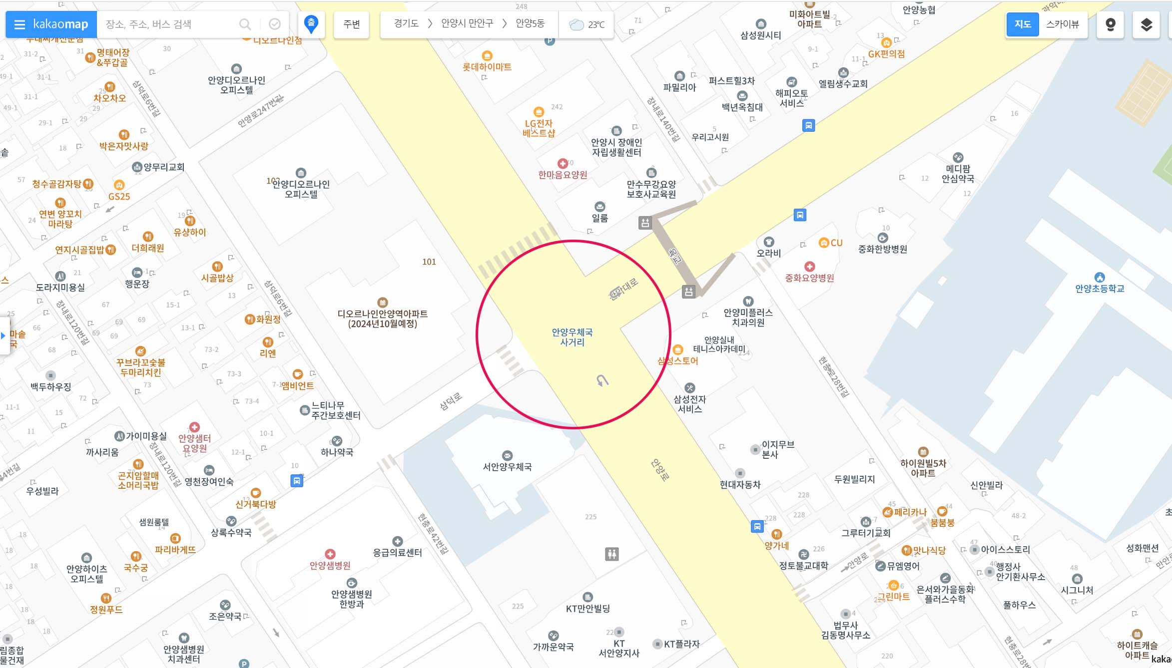 뿐만 아니라 통상적으로 안양우체국 사거리 하면 안양5동 우체국앞을 떠올리고 지도에도 안양우체국사거리로 표기되어 있다.