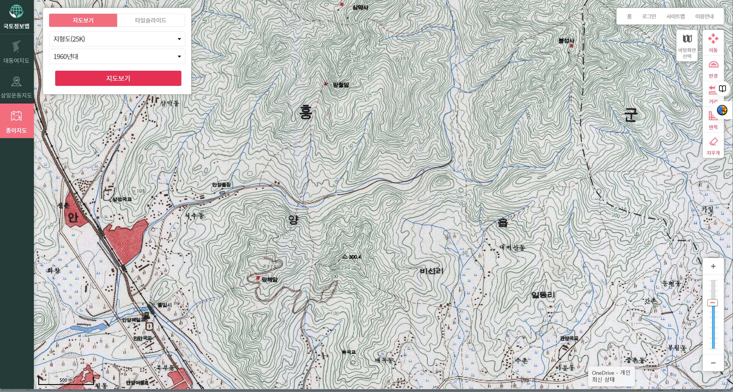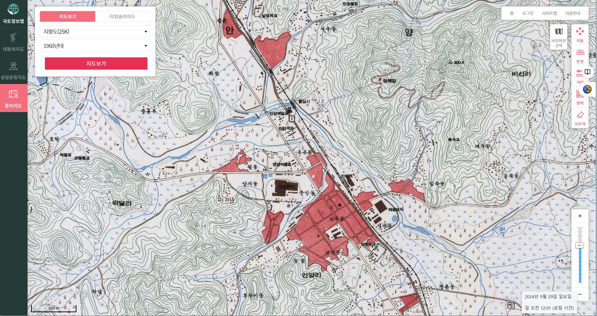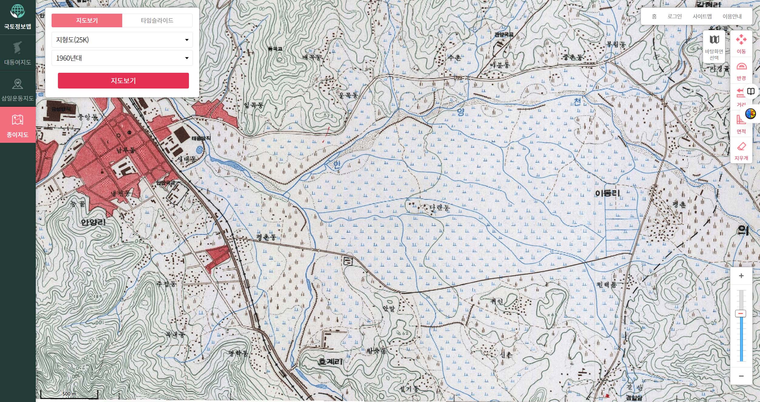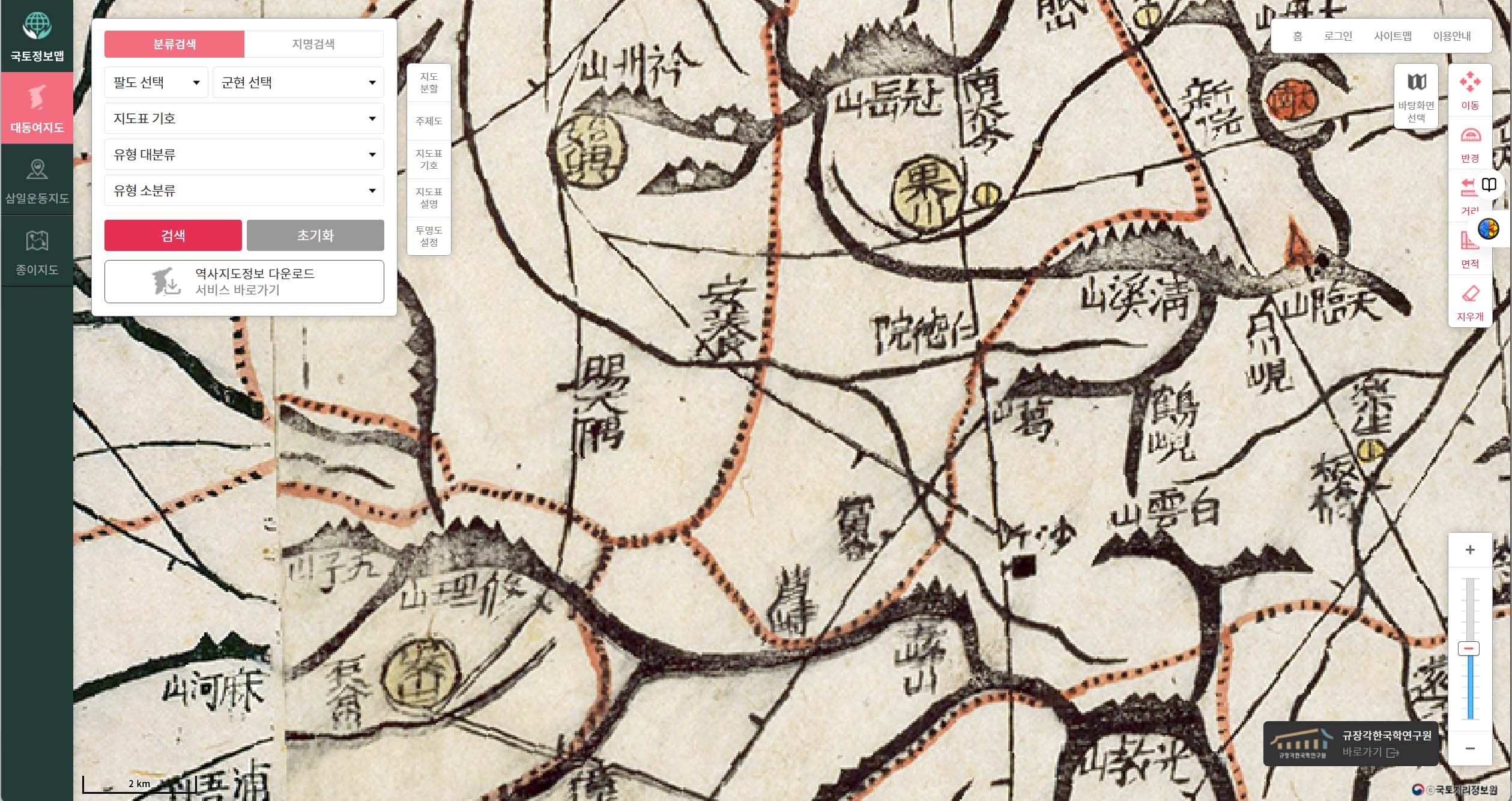 특히 역사지도 웹페이지에서는 대동여지도, 삼일운동지도, 종이지도 등을 25K. 50K, 250K로 축소 또는 확대해서 볼수 있다