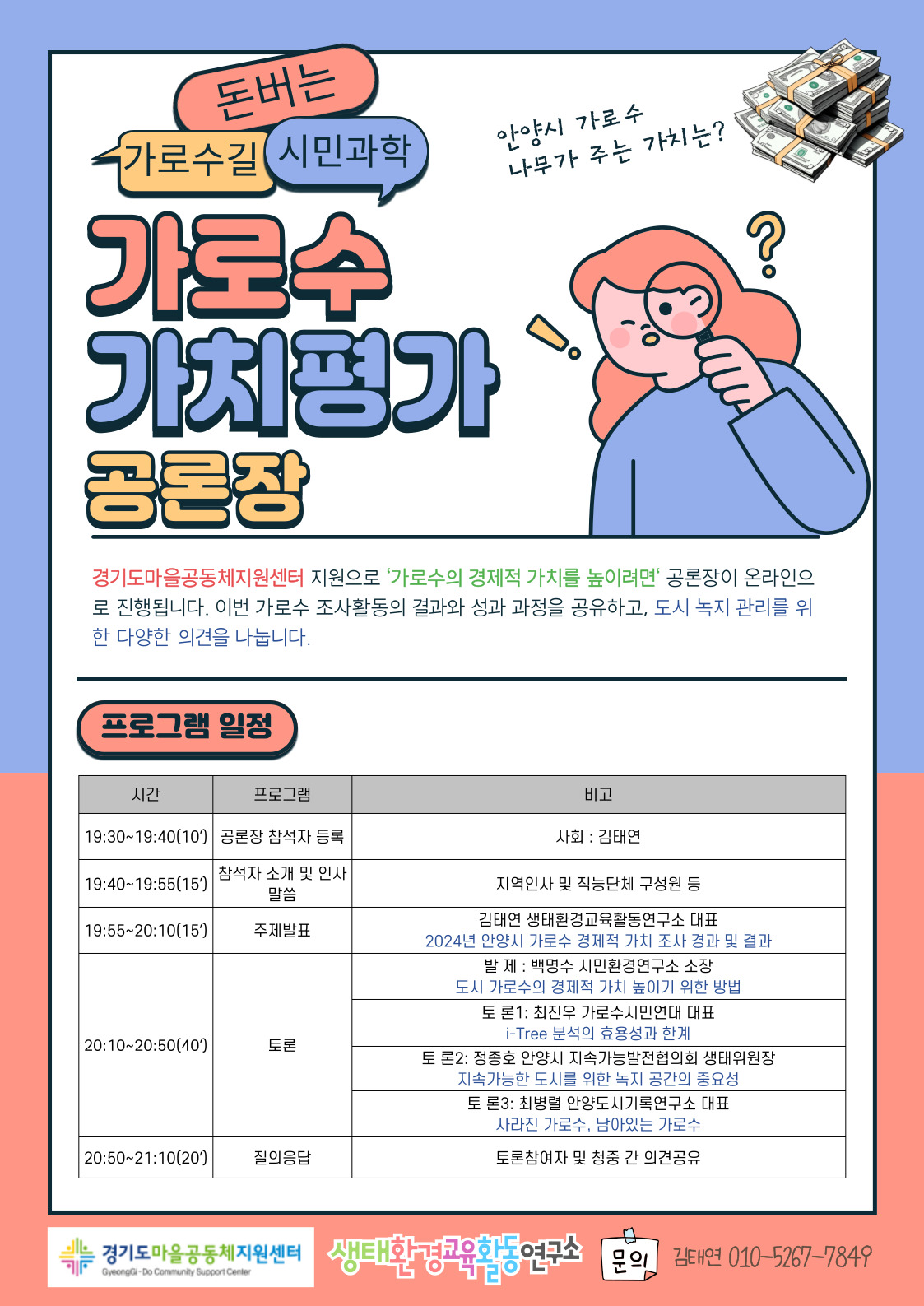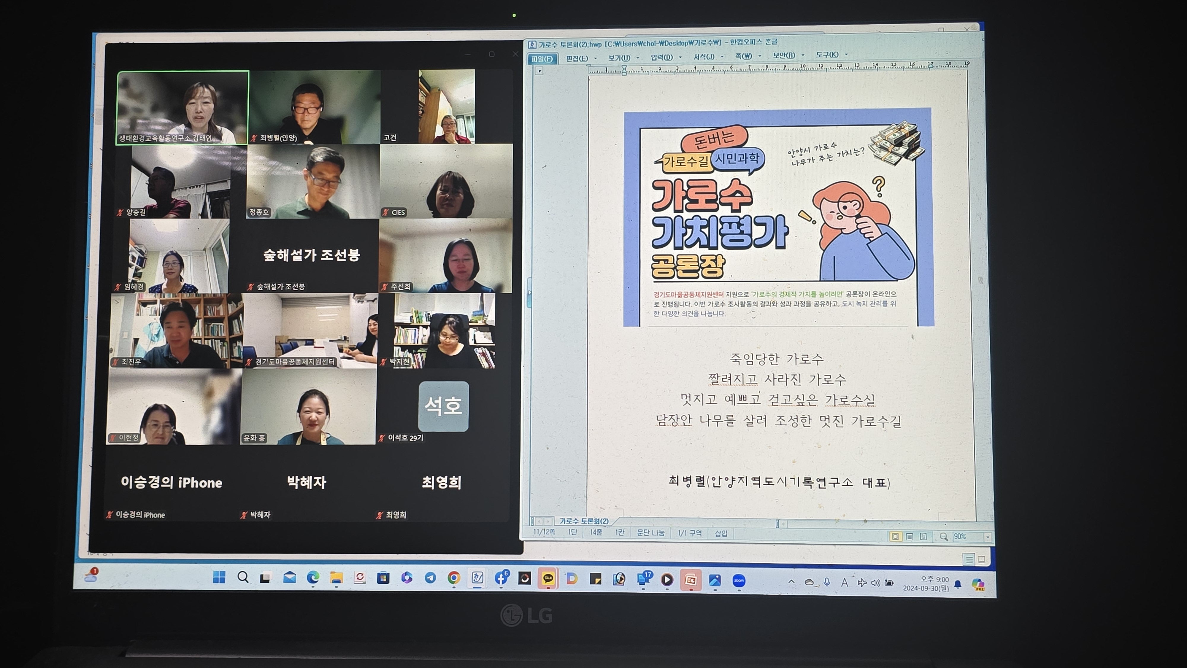 2024.09.30/ #사람들 #토론회 #공론장 #줌회의/ 생태환경교육활동연구소에서 주관하고 경기마을공동체지원센터 지원으로 안양에서 가로수 시민조사활동이 폭염이 한반도를 뜨겁게 달구었던 7-8월에 진행되었습니다. 무더위가 계속되는 지금의 기후재앙의 상황에 도시의 온도를 낮춰주고, 보행자에게 그늘을 주고, 미세먼지도 걸러주고, 도시 토지를 지탱해주는 많은 역할을 하는 가로수에 대해 다시 생각해보게 되었고, 현재 가로수의 상태가 어떠한지 고민하고 살펴보게 합니다.
