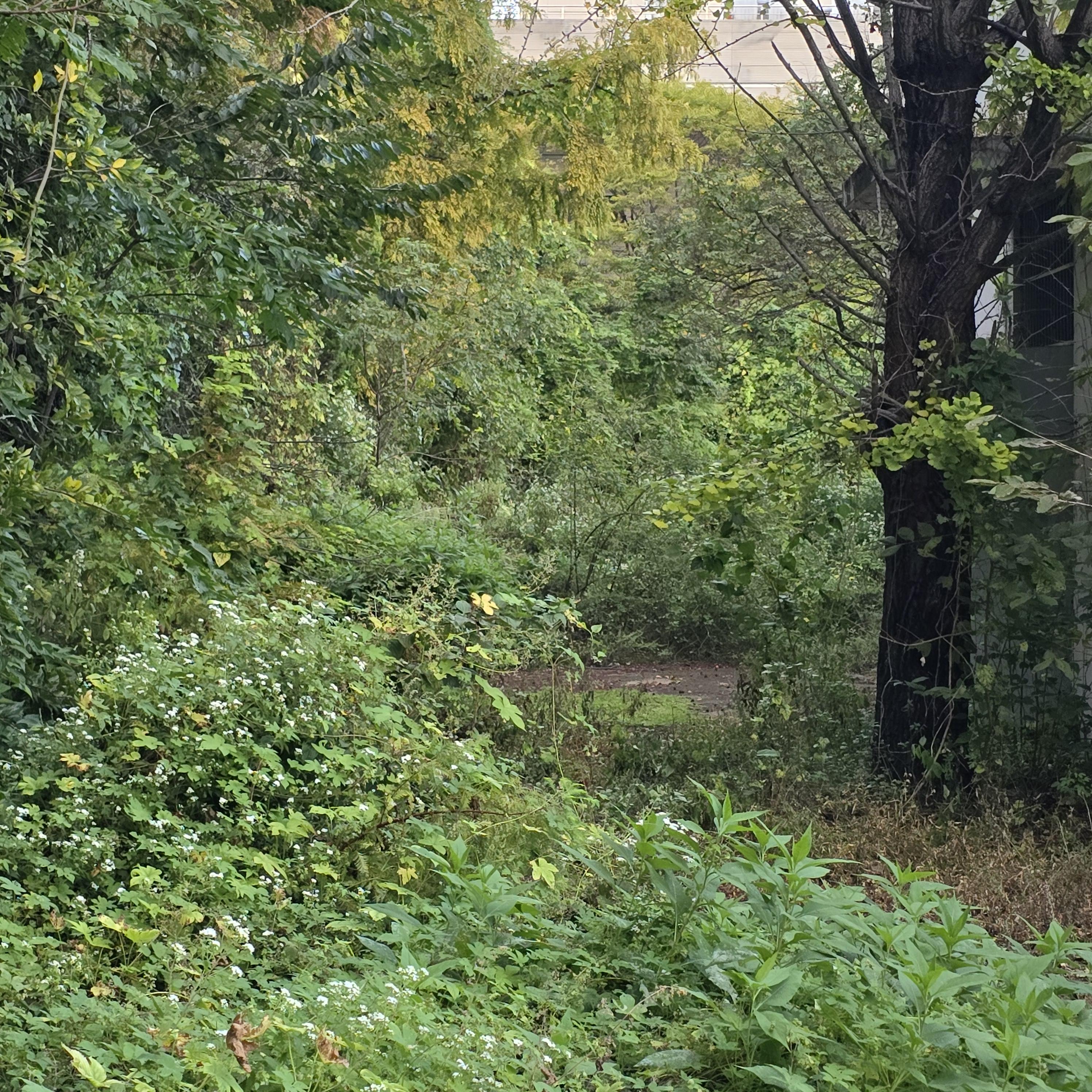 2024.10.01/ #도시기록 #옛검역원 #미개방구역/ 사람의 발길이 오랫동안 끊겻던 안양6동 옛검역원내 철조망 안쪽 제한구역. 해질 무렵아라 사진이 흐릿하지만 나무는 빛을 차단할 만큼 하늘을 가리고 수풀은 마치 밀림을 연상케한다.