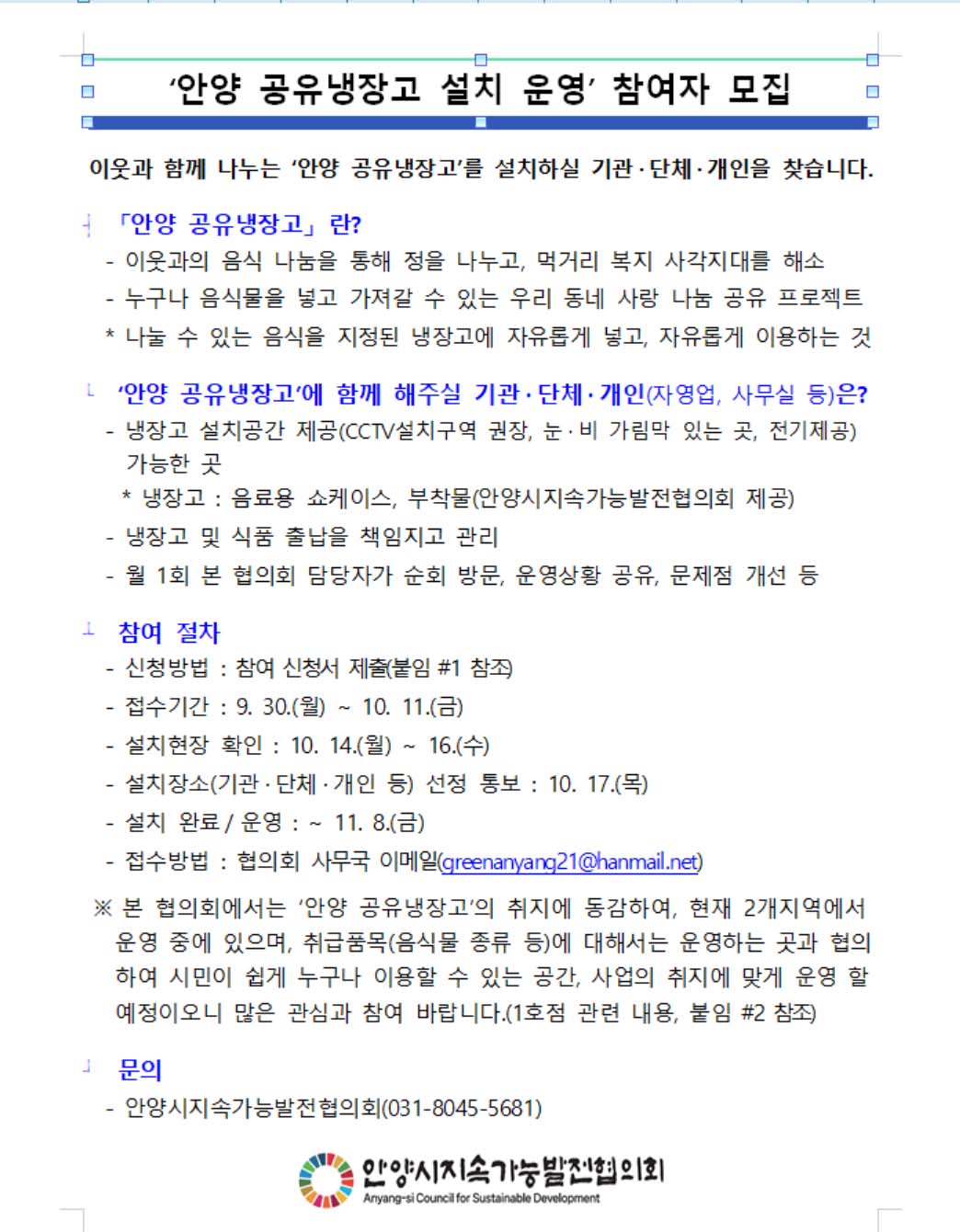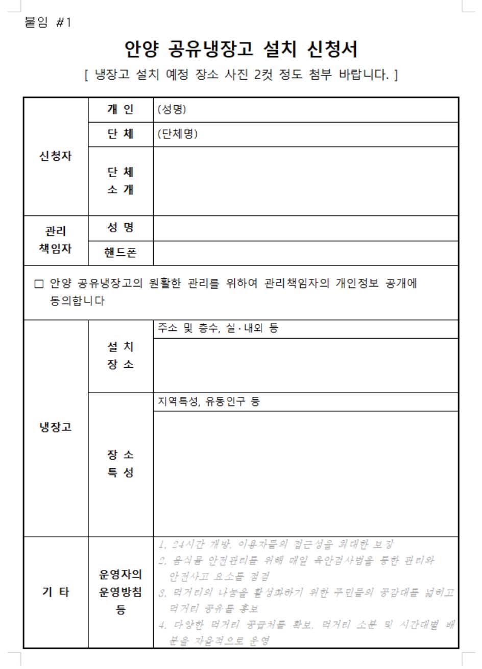 안양시와 안양시지속가능발전협의회에서 공유냉장고를 설치운영할 운영자를 모집한다.