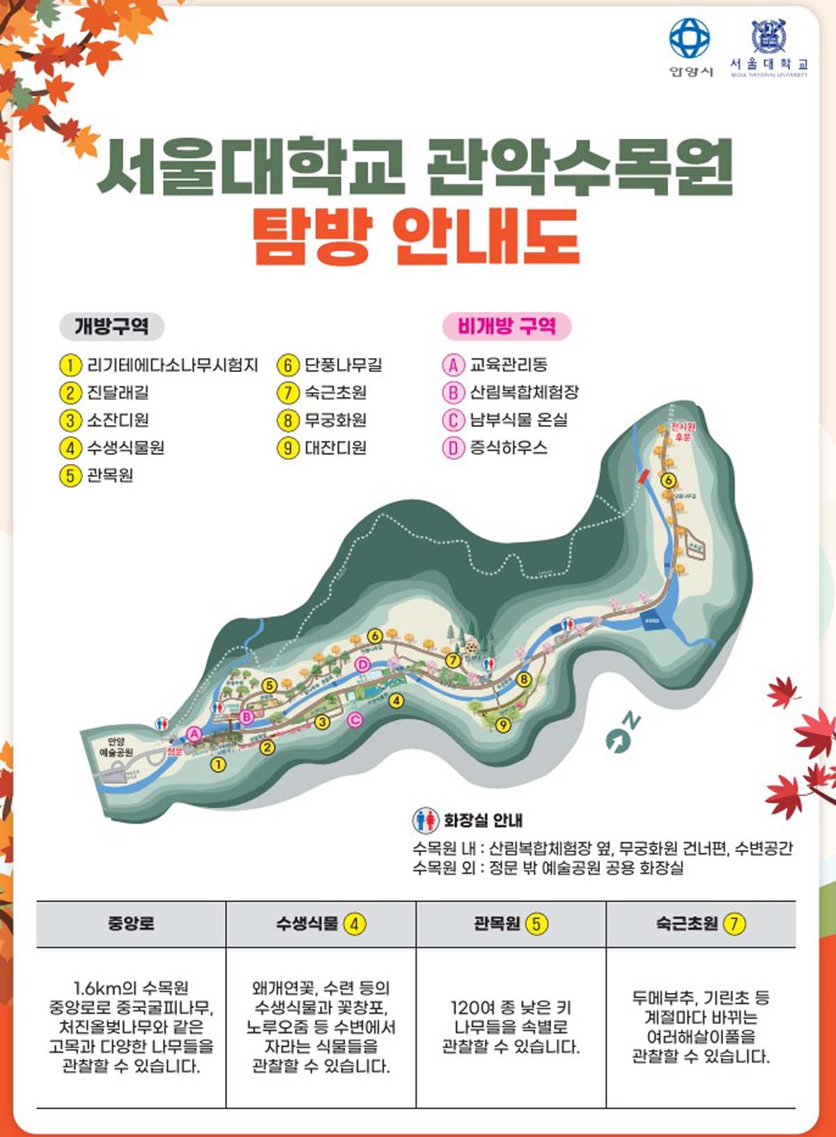 서울대 관악수목원이 오는 10월 19일부터 11월 17일까지 29일간 매일 09시-17시까지(입장마감 16시30분)시범 개방된다.