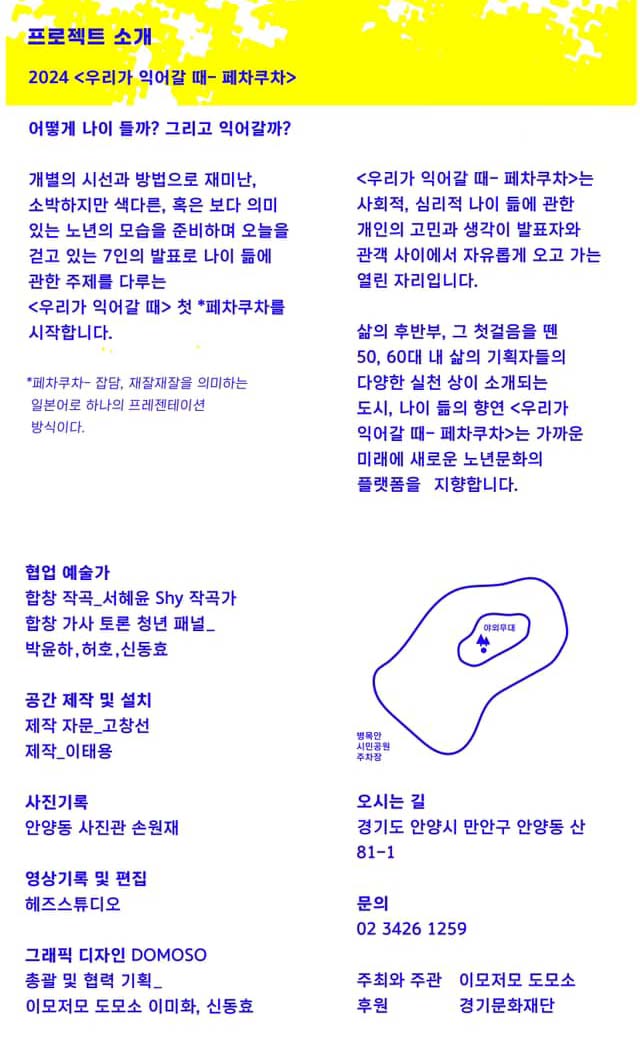 안양에 위치한 소셜 아트 및 소셜 프로덕트 디자인 그룹 "이모저모 도모소"에서 2024년 경기 지역문화 지원 통합공모 경기 지역문화 활성화 프로젝트 지원사업에 선정돼 사업비를 지원받아 오는 9일 오후4시 안양9동 병목안시민공원에서 신중년의 우리가 익어갈때 페차쿠차를 개최한다.