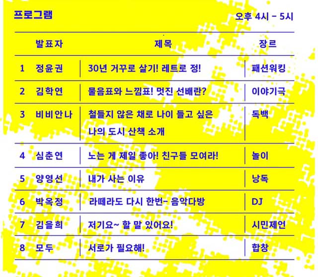 페차쿠차란 잡담, 재잘재잘을 의미하는 일본어로 하나의 프리젠테엔이션방식을 말하는데 50-60대 안양사람 7명이 무대에 올라 다양한 방식과 형태로 나이듦에 관한 주제로 발표하고 표현할 예정이다.