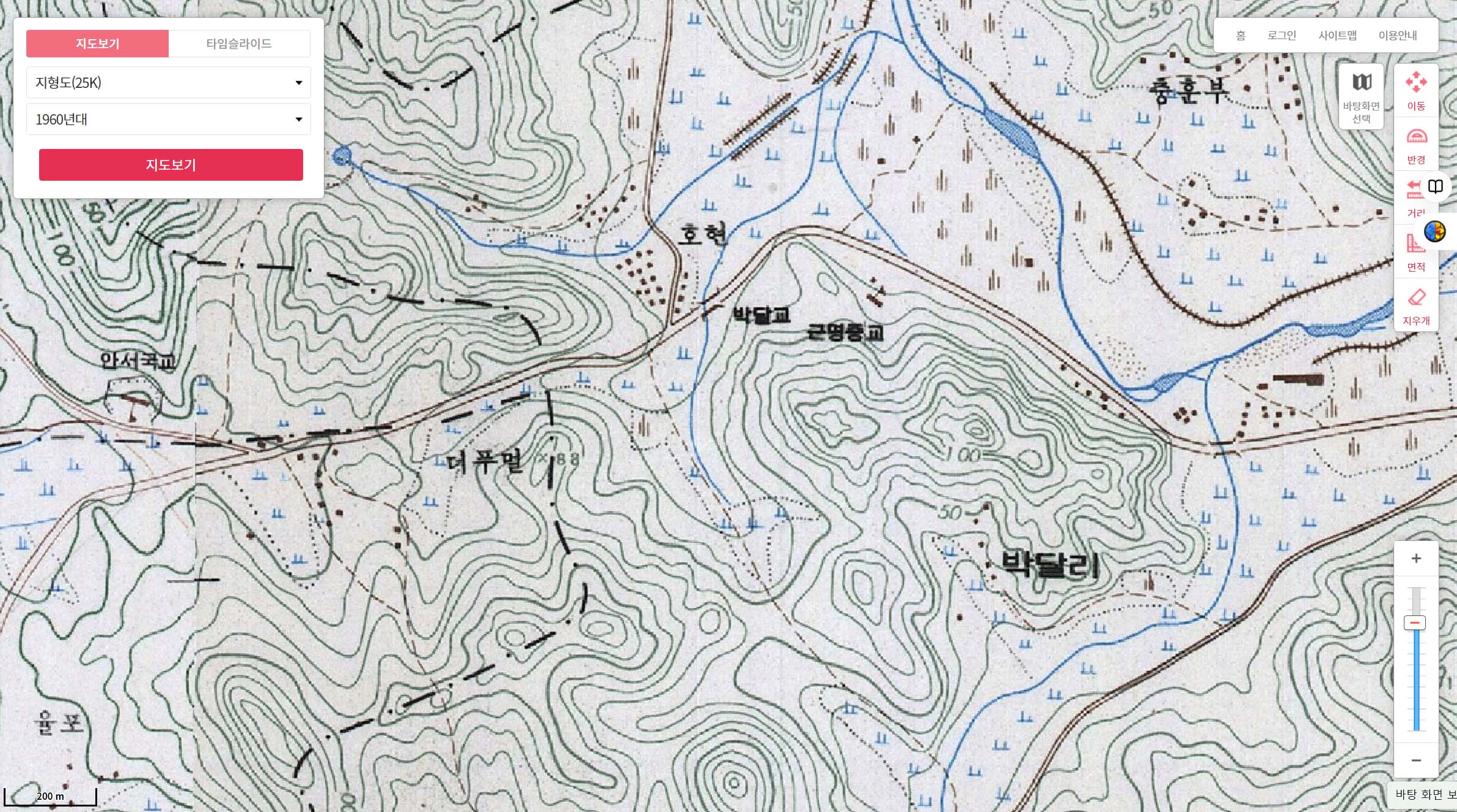 위 지도는 1960년대 안양의 지형도로 당시 안양 박달리 일대 모습으로 당시 안양과 안산의 경계로 현재 범고개라 불리우고 쓰여지는 고개가 더푼물(더푸멀로 표기) 이었음을 보여준다.