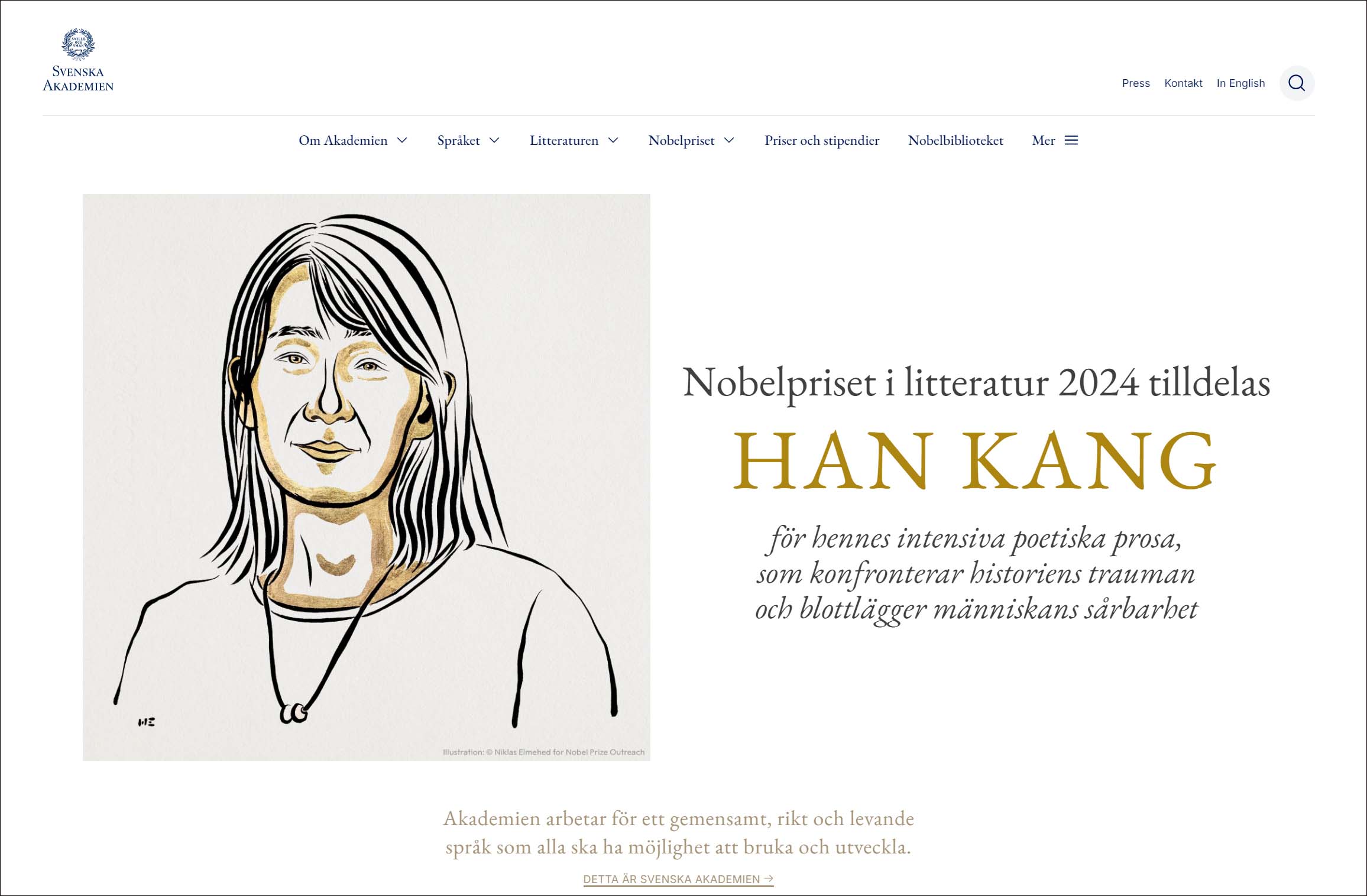 스웨덴 아카데미(Swedish Academy)는 10일 저녁 8시(한국시각) 2024년 노벨문학상 수상자로 한국 작가 한강을 선정했다고 발표했다. 한국인이 노벨상을 받은 것은 지난 2000년 평화상을 탄 고(故) 김대중 전 대통령에 이어 두번째로 24년 만이며 문학상은 사상 처음이다.