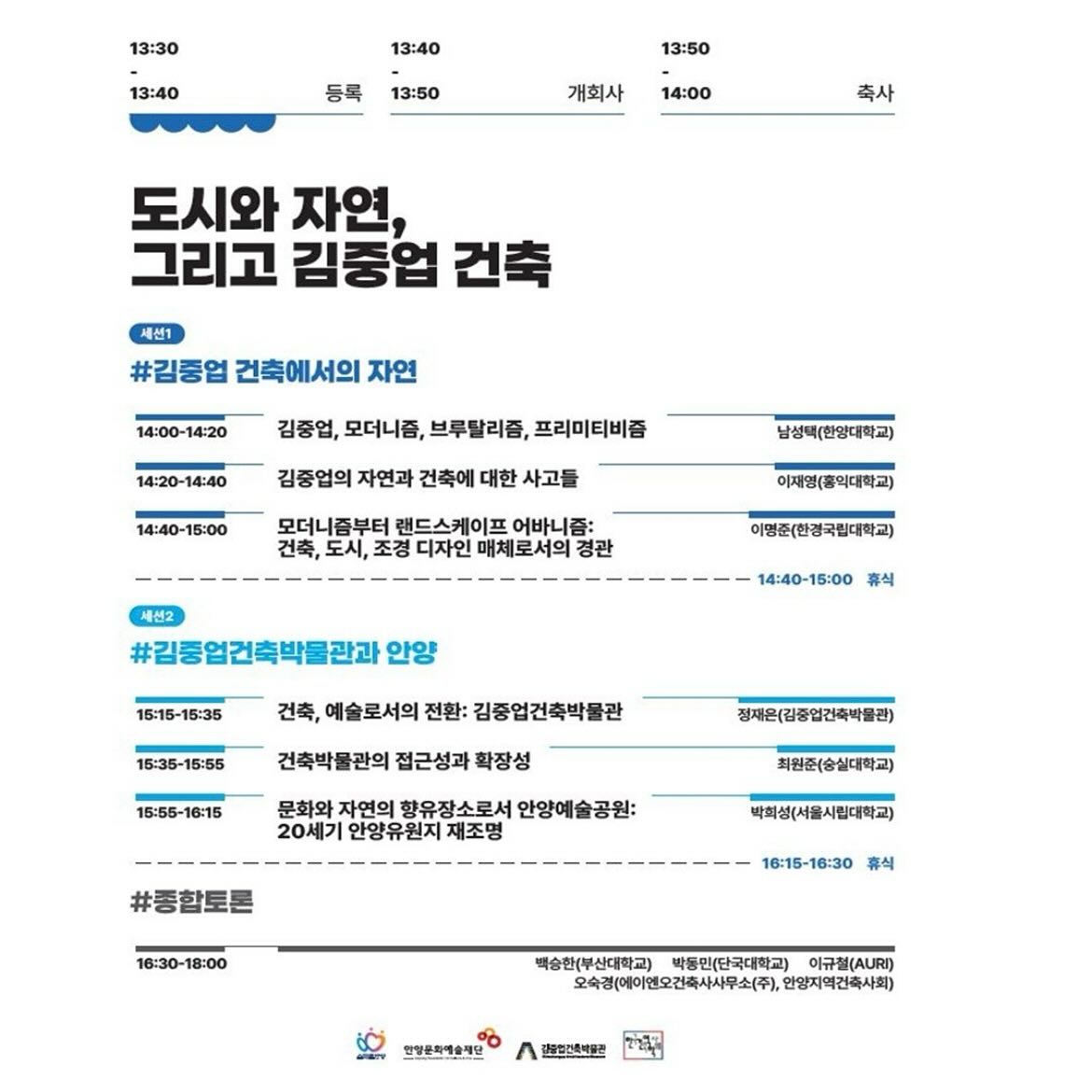 이어 종합토론으로 백승한 부산대학교 교수, 박동민 단국대학교 교수, 이규철 AURI 연구위원, 오숙경 안양지역건축사회 회원 등이 참여해 김중업건축박물관 미래와 연구 방향에 관해 토론을 진행할 예정이다.