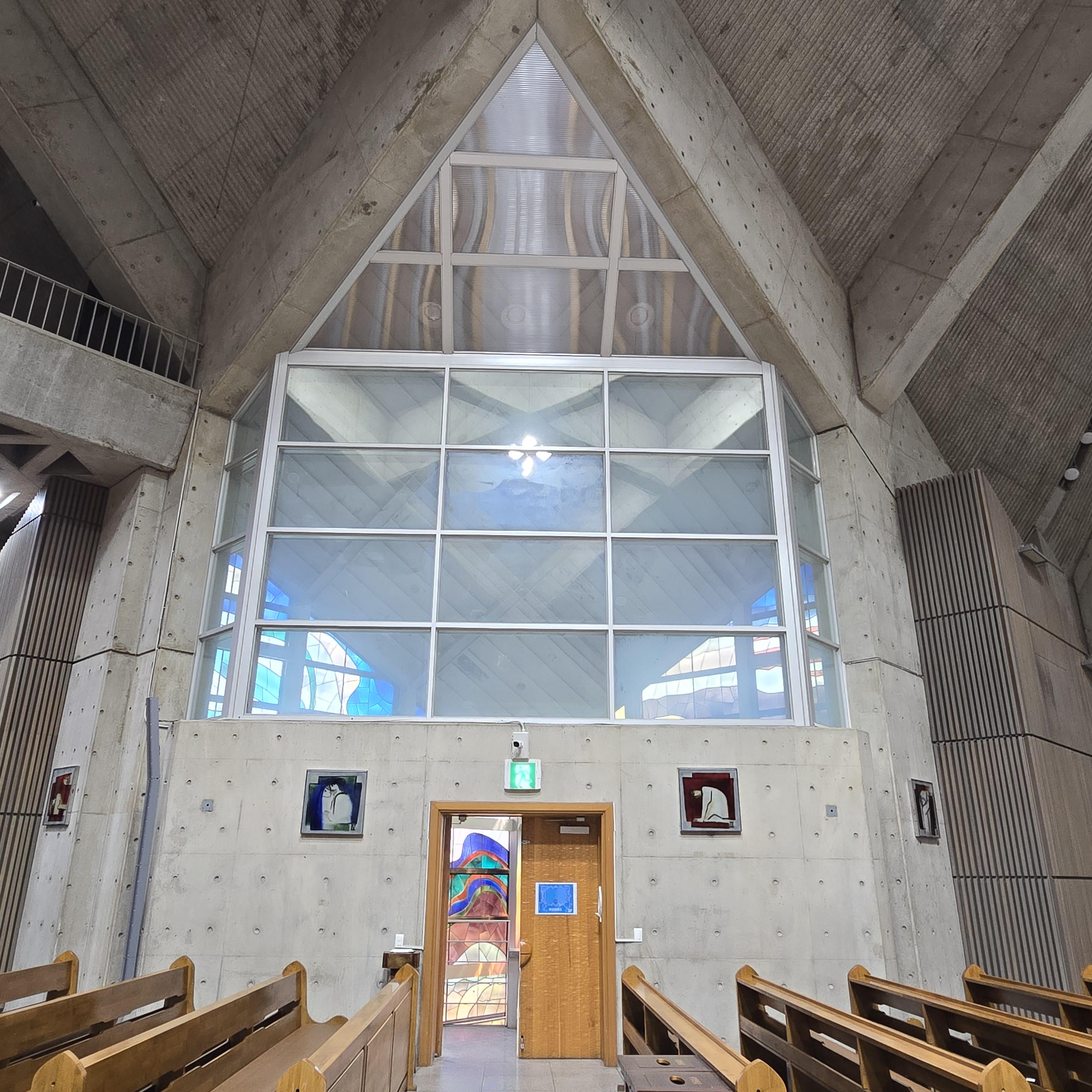 최종단계에서 2500석으로 줄어들긴 하였지만 36mx54m 규모의 대규모 신자석을 무주공간으로 처리하기 위해 특수한 구조형식을 고려했다. 무주공간을 해결하기 위한 다양한 해법이 있지만, 일반적인 구조개념으로는 종교건물로서의 공간을 표현하기 어렵기 때문이다. 종교우선 건물이 갖는 특수한 형태와 내부공간, 구조 등을 고려하여 사각형의 대각선 사용을 기본으로 하였다. 사각형의 대각선을 이용하여 마름모꼴에 가까운 내부공간을 마련하였으며, 지붕은 이 대각선을 축으로 하이퍼 쉘(Hyper Shell) 쌍포물선면을 형성하며 부드러운 곡선을 만들어내고 있다.