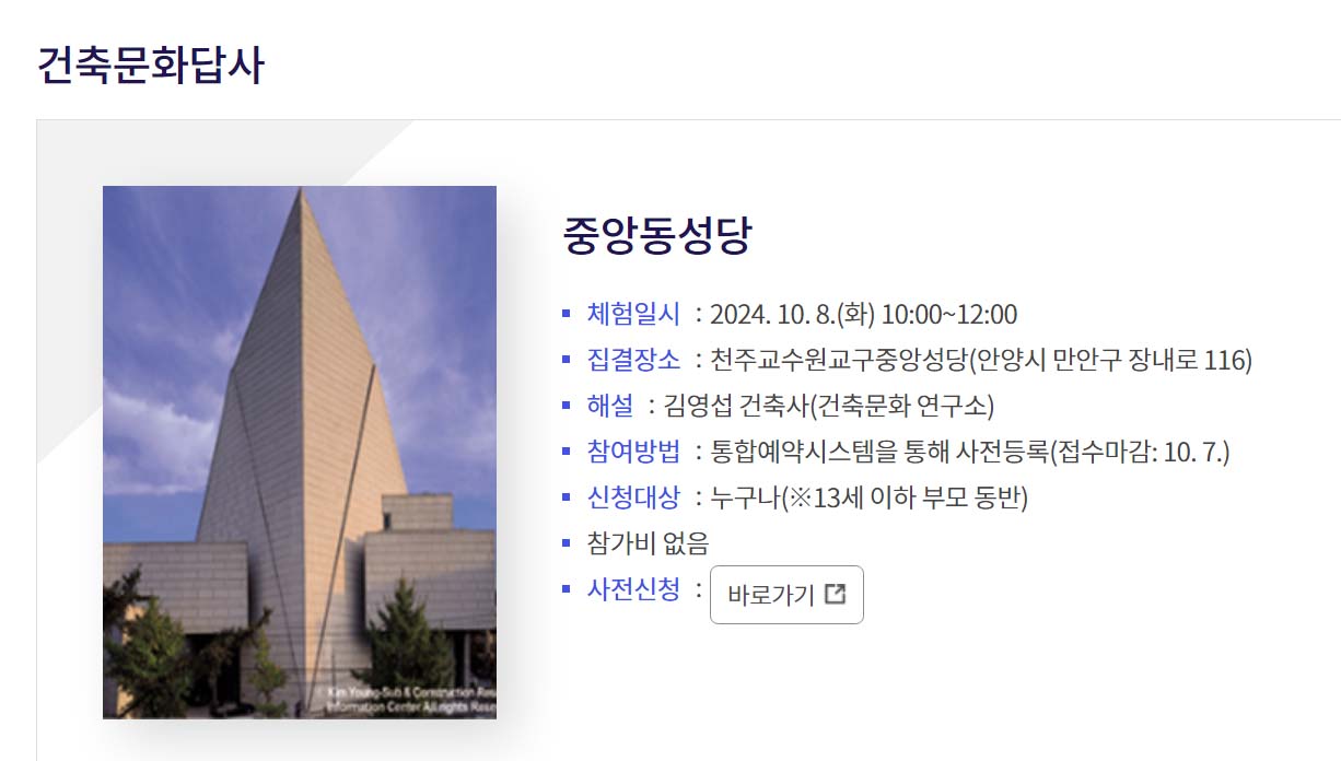 안양지역 건축사회 주최로 지난 10월 5일부터 12일까지 "건축과 자연 그리고 우리”를 슬로건으로 열린 제4회 안양건축문화제 프로그램의 하나로 천주교수원교구중앙성당(안양 만안구 장내로)을 설계한 김영섭 건축사와 함께하는 건축문화 답사가 10월 8일 오전 진행됐다.