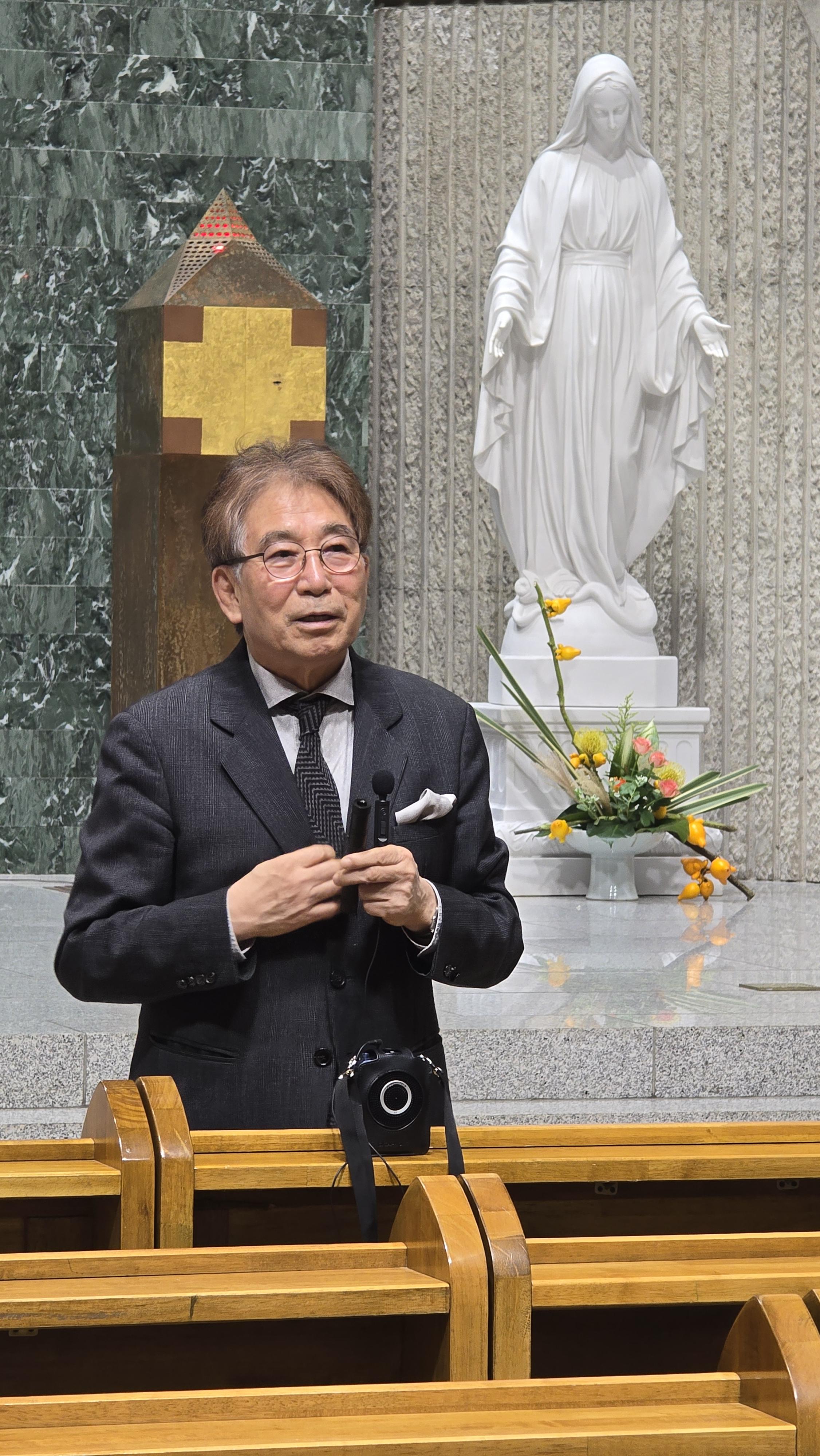 김영섭 건축사는 이날 성당을 돌아보기전 성당 지하 회의실에서 가진 참석자들과의 대화에서 건축사로 살아온 이야기와 더불어 중앙성당 건축에 쓰여진 외장재에 패널 등은 물론 창호와 성구, 가구들까지 설계와 건축과정에서 있던 일들을 들려주었다.