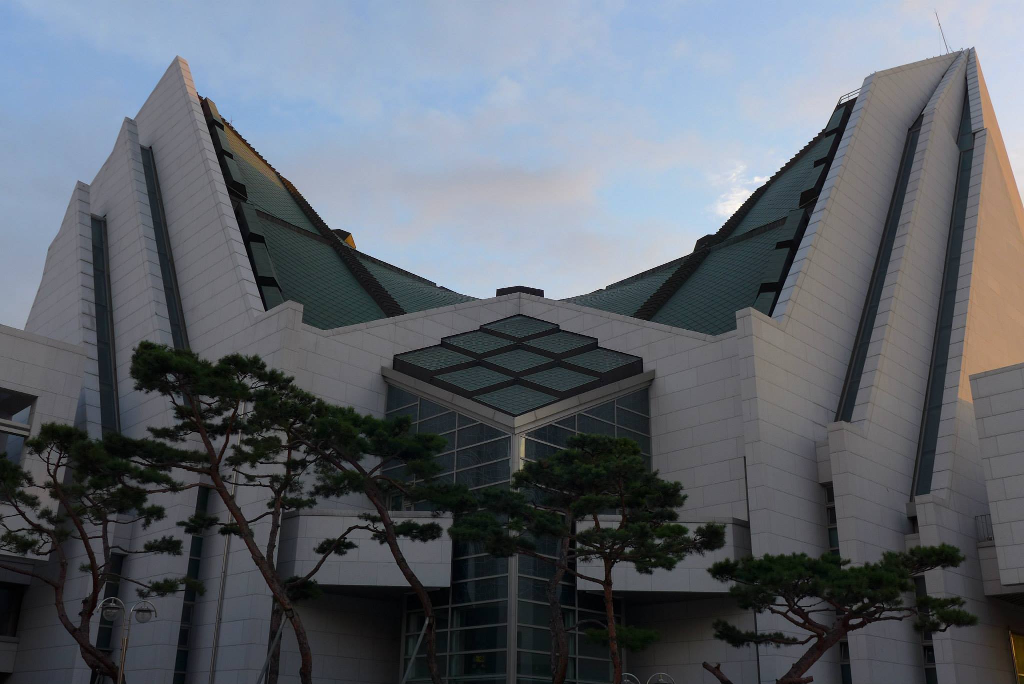 대각 교차선 네 개의 높이를 다르게 잡아 교차시킴으로 생기는 리지드 프레임(Rigid frame)을 선택하게 됨에따라 구조적 이점과 마름모형에 가까운 내부공간이 형성되어 음향 처리가 수월해지고, 외부는 자연스럽게 쌍곡포물선면(Hyper shell)이 형성되어 아름다운 지붕이 만들어지게 되었다.