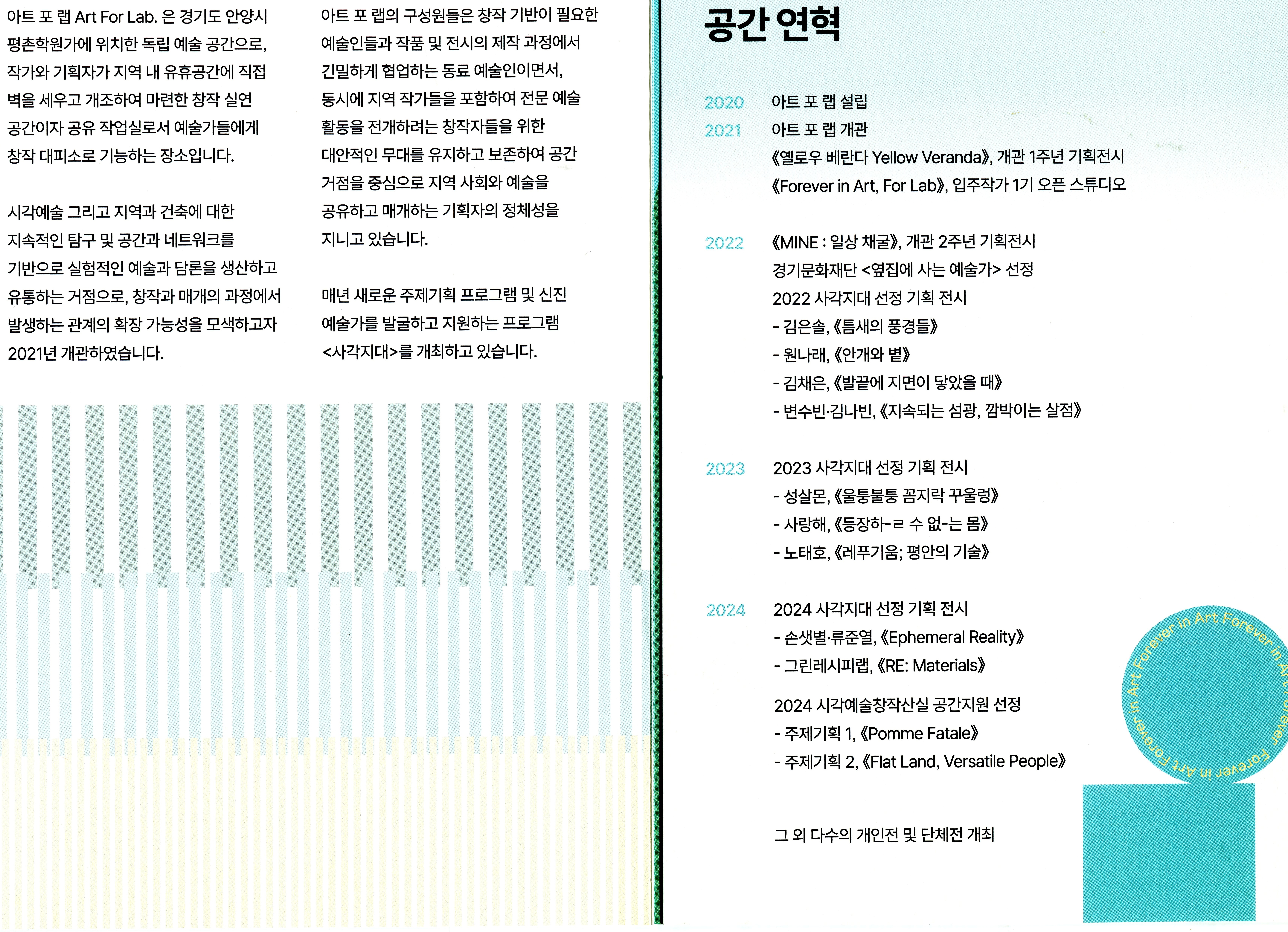 안양 평촌학원가 신촌동 골목에 자리한 아트 포 랩(Art For Lab)은 독립 예술 공간이자 공유 작업실로, 2021년에 개관한 이래로 작가들이 기획하고 운영해 온 다매체적 예술 실험 공간이다.