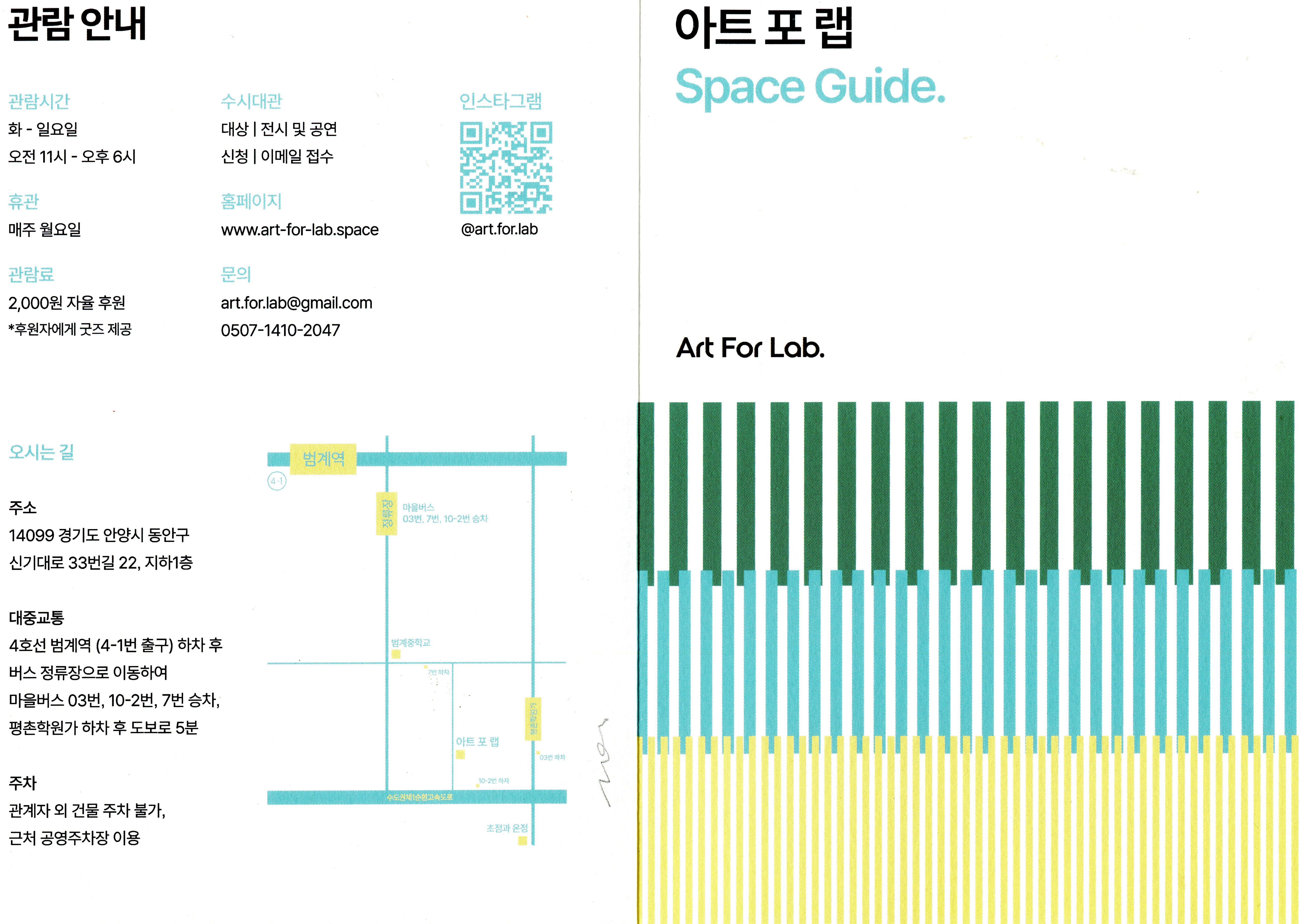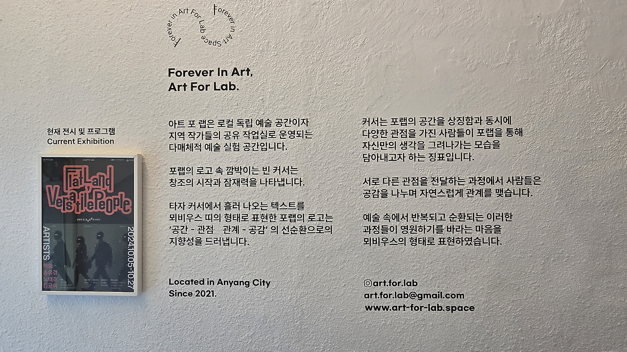 안양 평촌학원가 신촌동 골목에 자리한 아트 포 랩(Art For Lab)은 독립 예술 공간이자 공유 작업실로, 2021년에 개관한 이래로 작가들이 기획하고 운영해 온 다매체적 예술 실험 공간이다.