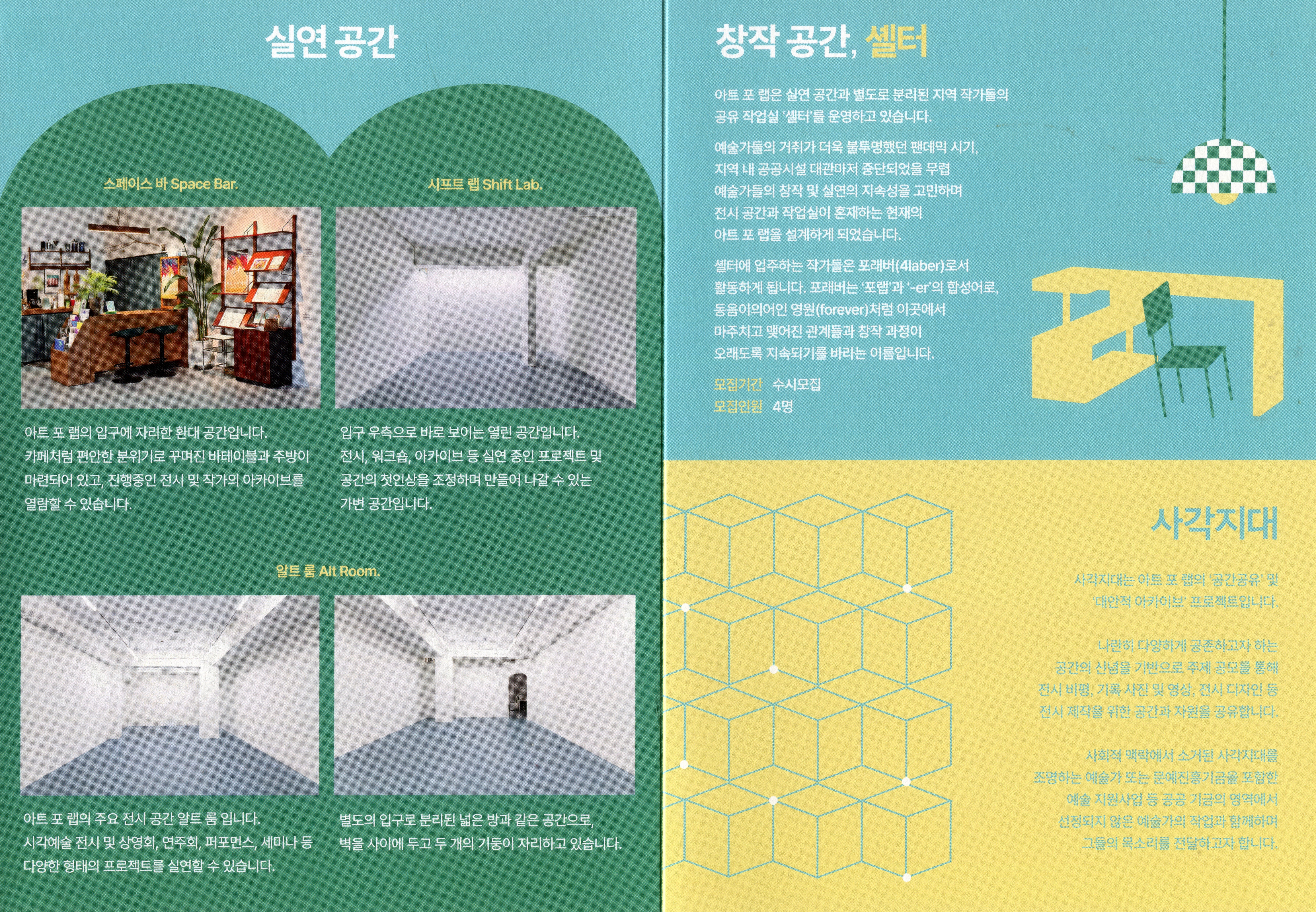 이곳에서는 미디어와 공간을 기반으로 실험적인 예술과 담론을 생산하고 있으며 아트 포 랩은 공유 작업실 및 공간 대관 서비스를 제공한다.