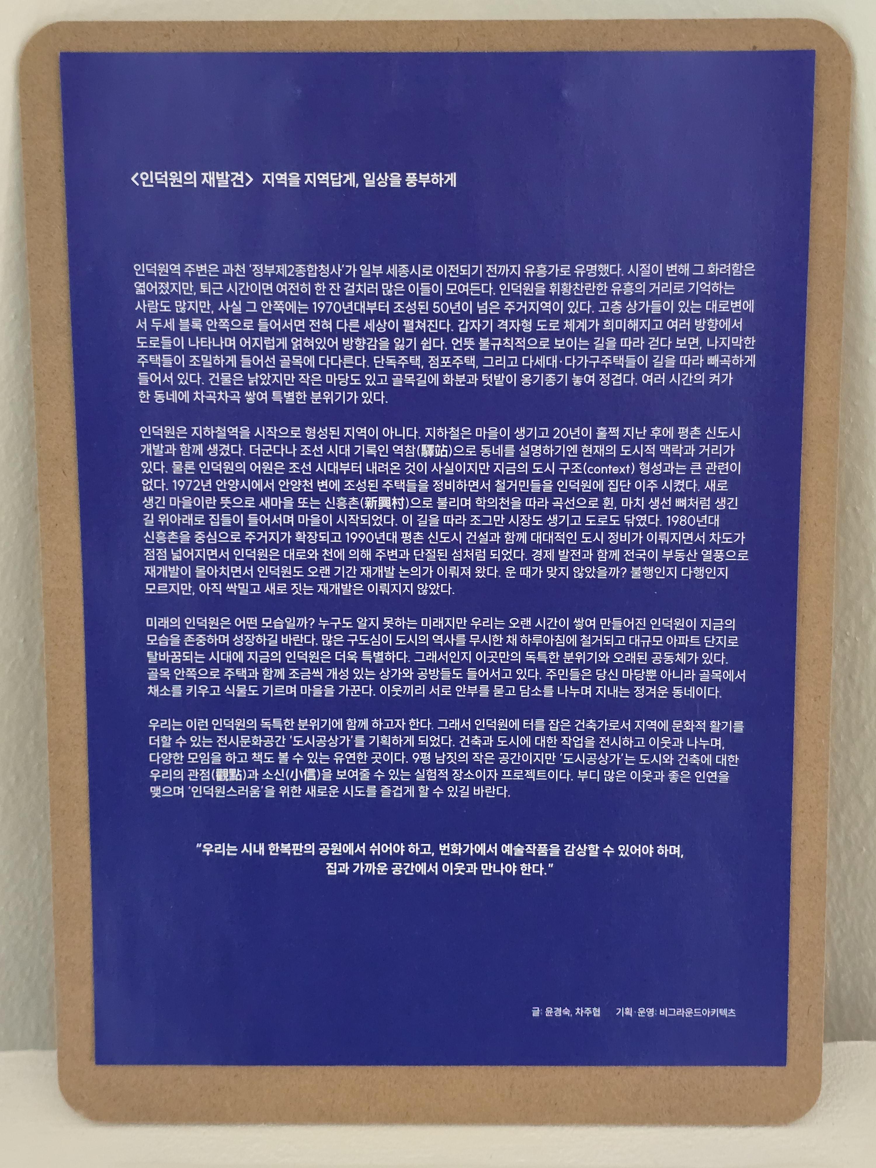 하지만 이러한 변화는 거시적으로는 안양을 다층적이고 울퉁불퉁하게 만드는 변화가 아니라 잘 구현된 대도시의 표본이 되는 평평한 땅으로 만드는 것 처럼 느껴졌다. 전시는 이처럼 평평해 보이는 안양을 다시금 울퉁불퉁하게 만들어 수도권 남부에 자리한 '도시 1'이 아니라 '이야깃거리가 많은 안양'으로 만들고자 한다.