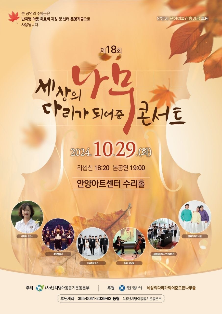 제18회 “세상의 다리가 되어 준 나무콘서트”가 오는 10월 29일 오후 7시 안양아트센터 수리홀에서 열린다.