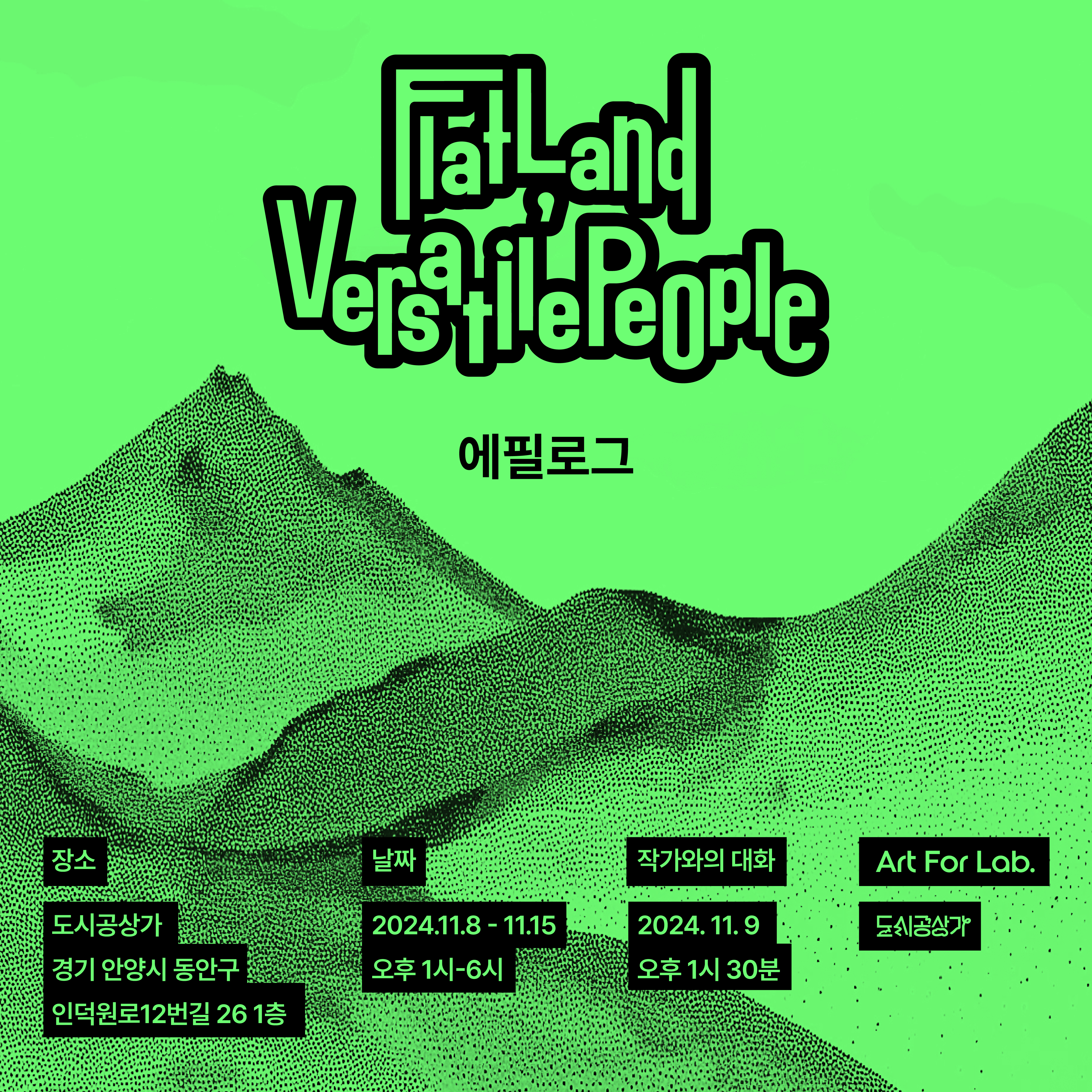 안양에서 유년 및 청년기를 보낸 네 명의 젊은 작가들이 평평하다 못해 납작하게 포장된 땅 어딘가 모난 돌처럼 튀어나온 이야기를 발굴하고, 찾아낸 이야기들을 탐구하고 자신만의 해석을 더해 도시의 얼굴로 재인식하여 만든 전시 'Flat Land, Versatile People 평평한 땅, 울퉁불퉁한 이야기' 전시가 10월-27일까지 안양 평촌 학원가 신촌동 골목에 자리한 아트 포 랩에서 전시를 종료한데 이어 11월 8일부터 15일까지 안양 인덕원에 자리한 도시공상가에서 연장 전시를 한다.