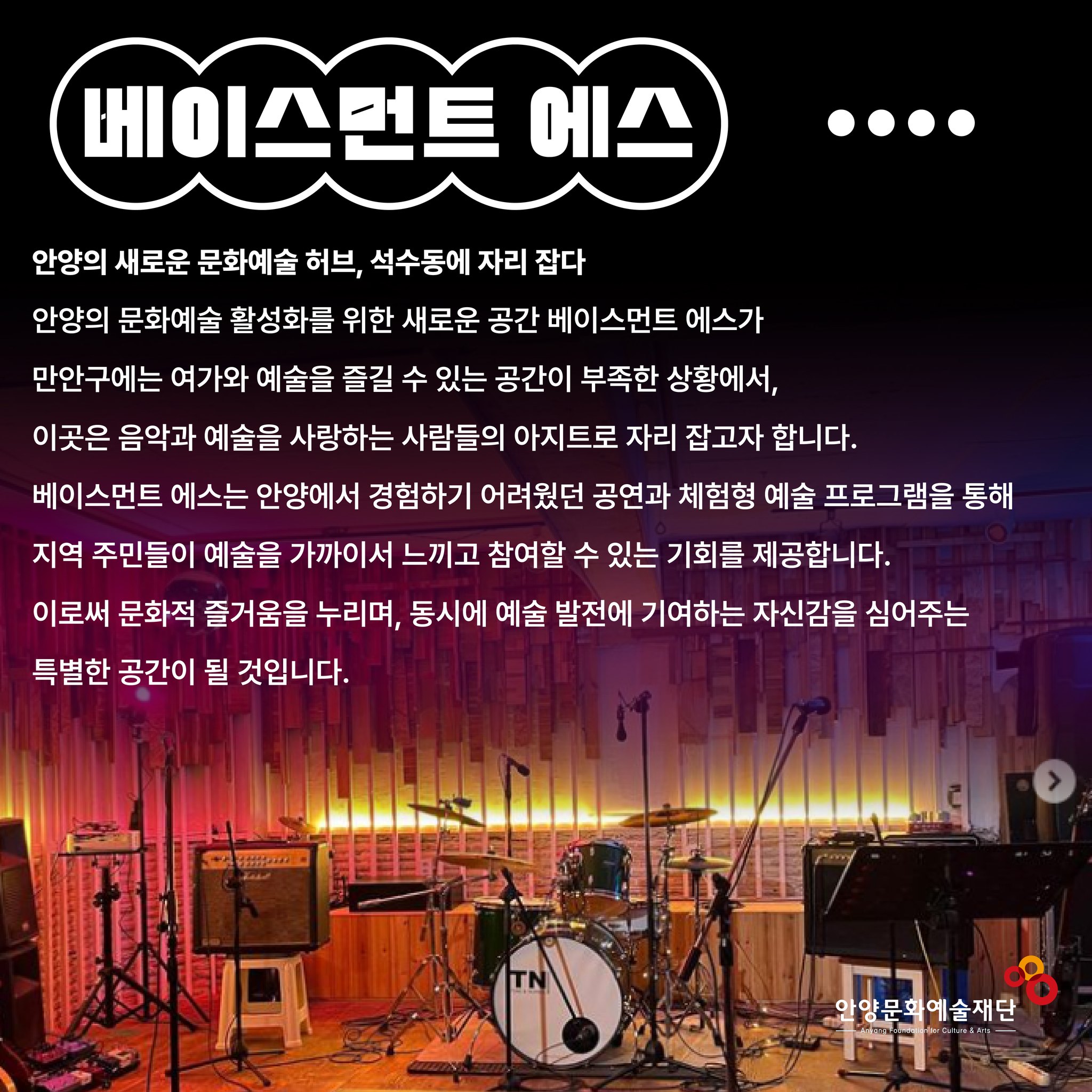 베이스먼트 에스는 안양에서 경험하기 어려웠던 공연과 체험형 예술 프로그램을 통해 지역 주민들이 예술을 가까이에서 느끼고 참여할 수 있는 기회를 제공하고 음악과 예술을 사랑하는 사람들의 아지트 공간을 꿈꾸며 공간을 마련했다.