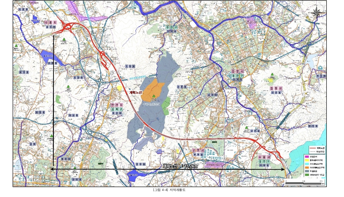 ‘시흥~수원 고속화도로 민간투자사업’은 시흥시 금이동에서 의왕시 고천동까지 15.2km 길이의 도로를 신설하는 사업으로 2020년 9월 금호건설 컨소시엄이 경기도에 제안한 민자도로 사업입니다. 인구밀집지역을 지나는 구간은 지하로, 수리산도립공원을 관통하는 5.4km 군포시 구간은 터널로 계획되어 있습니다.