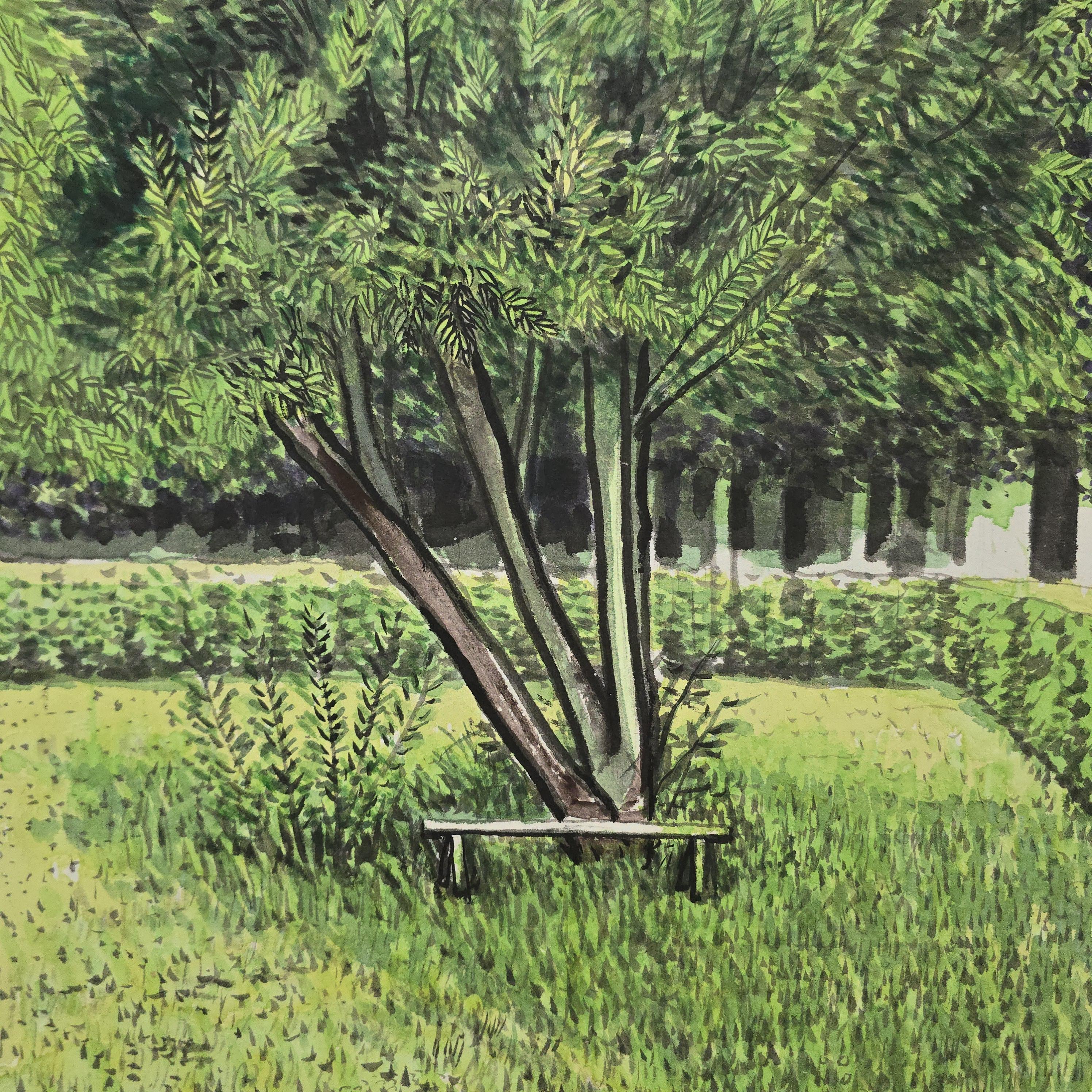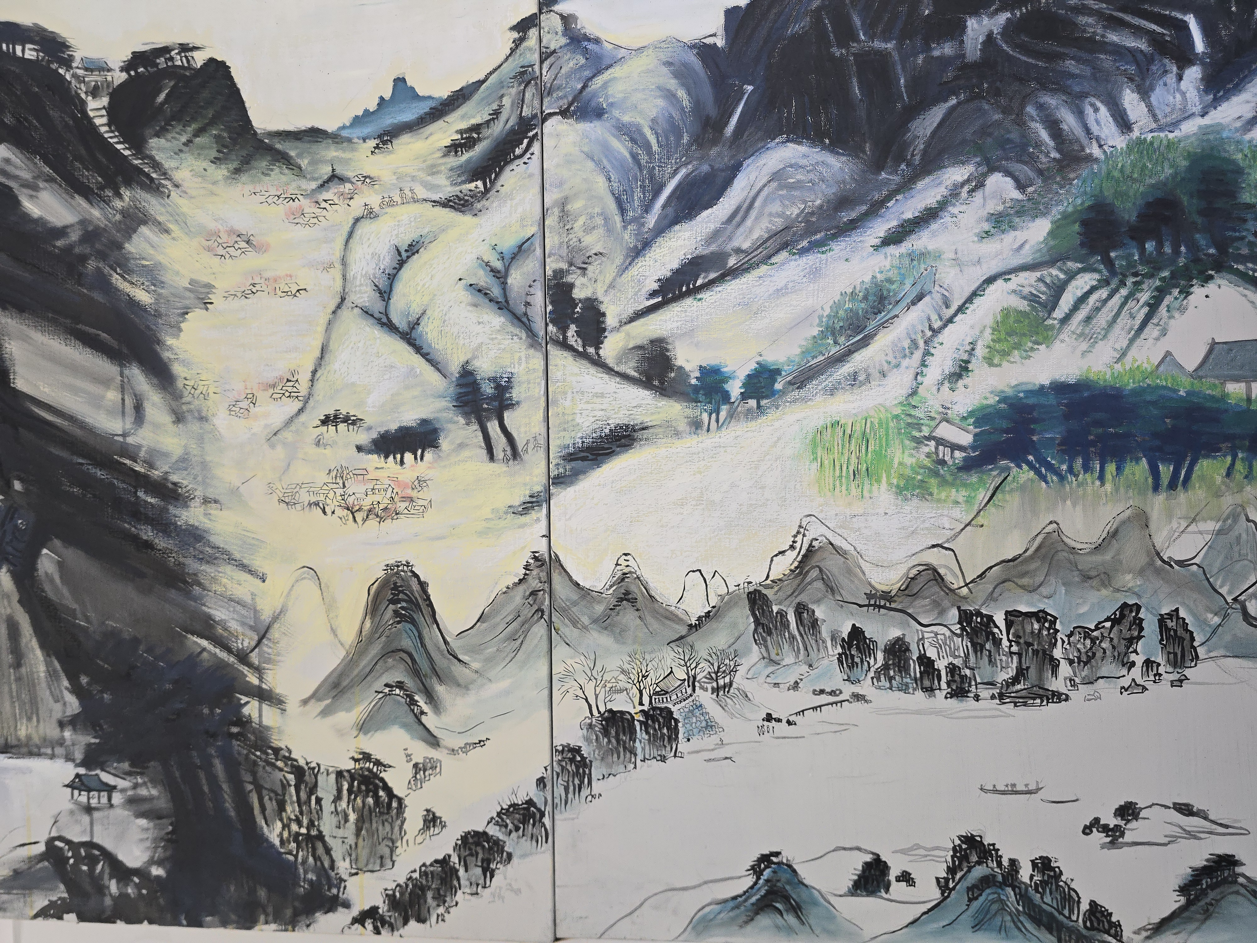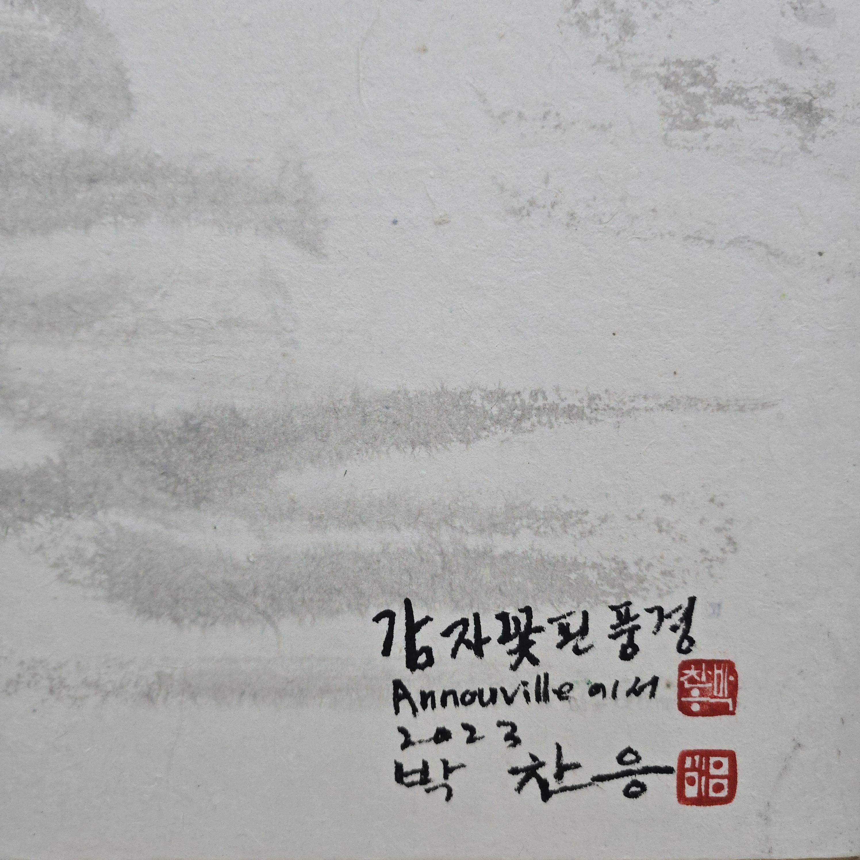 박찬응은 유화도 그리지만, 주로 종이와 먹을 사용해 그림을 그렸다. 한지(장지, 순지, 옥당지)와 프랑스 벽지 등 종이 위에 먹으로 그림을 그리면 적절한 번짐과 깊이를 낼 수 있다. 여러 번에 걸쳐 그려내는 유화와 달리 빠른 속도로 한 번에 그려내는 그림은 별도의 감각이 요구된다. 겸재(兼齎)나 청전(靑田)을 모사(模寫)하면서 그의 붓끝은 무엇을 찾는 것일까? 모사(模寫)는 동양화가들이 전통적으로 사용했던 그림 연구 방법이지만 나는 그가 무엇을 찾고 있는지 알 수 없다. 대신 그는 그림에 숨어 있는 이야기를 들려준다. 그가 모사했던 인왕제색도(仁王霽色圖)는 겸재(兼齎) 정선(鄭敾)이 친구 이병연(李秉淵)의 병문안을 마치고 돌아와 그렸다는데, 친구를 염려하는 겸재의 무거운 마음을 담고 있다. 인왕산의 바위는 습기를 머금고 위태로운 이병연의 집을 보듬어 안고 있다. 그림의 준법, 필치는 ‘칼 노래’처럼 감각과 리듬을 갖고 있다. 박찬응은 칼잡이 장수처럼 그 만의 붓질에 도달하기 위해 연습을 반복한다.