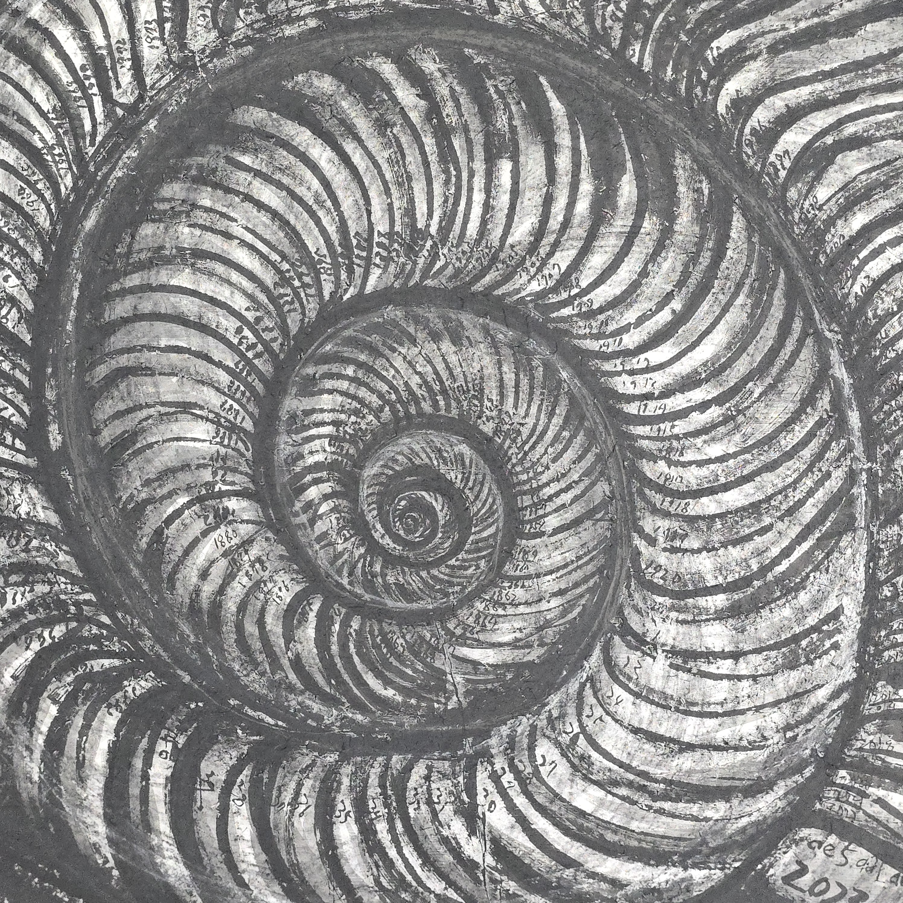 대표적인 작업이 <때무늬>(2024)다. 그는 어느 날 작업실 한쪽에서 오윤의 목판화 <칼 노래>를 떠 올리고는 그 간결하고 힘찬 선을 찾아 휘돌이 역사 무늬를 그려댔다. 거친 먹선은 마치 ‘암모나이트 화석’이나 ‘달팽이’ 모양을 하고 화면 중앙으로 말려 들어간다. 최제우의 시 <검결(劍訣)>을 불어로 번역해서 쓰고 휘돌이 무늬를 따라 한 해씩 연도를 적어 들어가 마침내 수운 최제우를 역도로 몰아 죽게 한 1864년에 도달한다. 그의 청년 시절 목판화는 그림 표현의 수단이기도 했고 그림책을 위한 명료하고 깨끗한 선화(線畫)의 매체가 되기도 했다. 그의 그림 구석구석에 나타나는 선명하고 깔끔한 굵은 선들은 이 시절 목판화에서 보았던 것들이다. 화면 위에 휘적이는 몸동작은 오윤의 <칼 노래>를 거쳐 최제우의 <검결>을 불러내고서야 멈춰 선다.