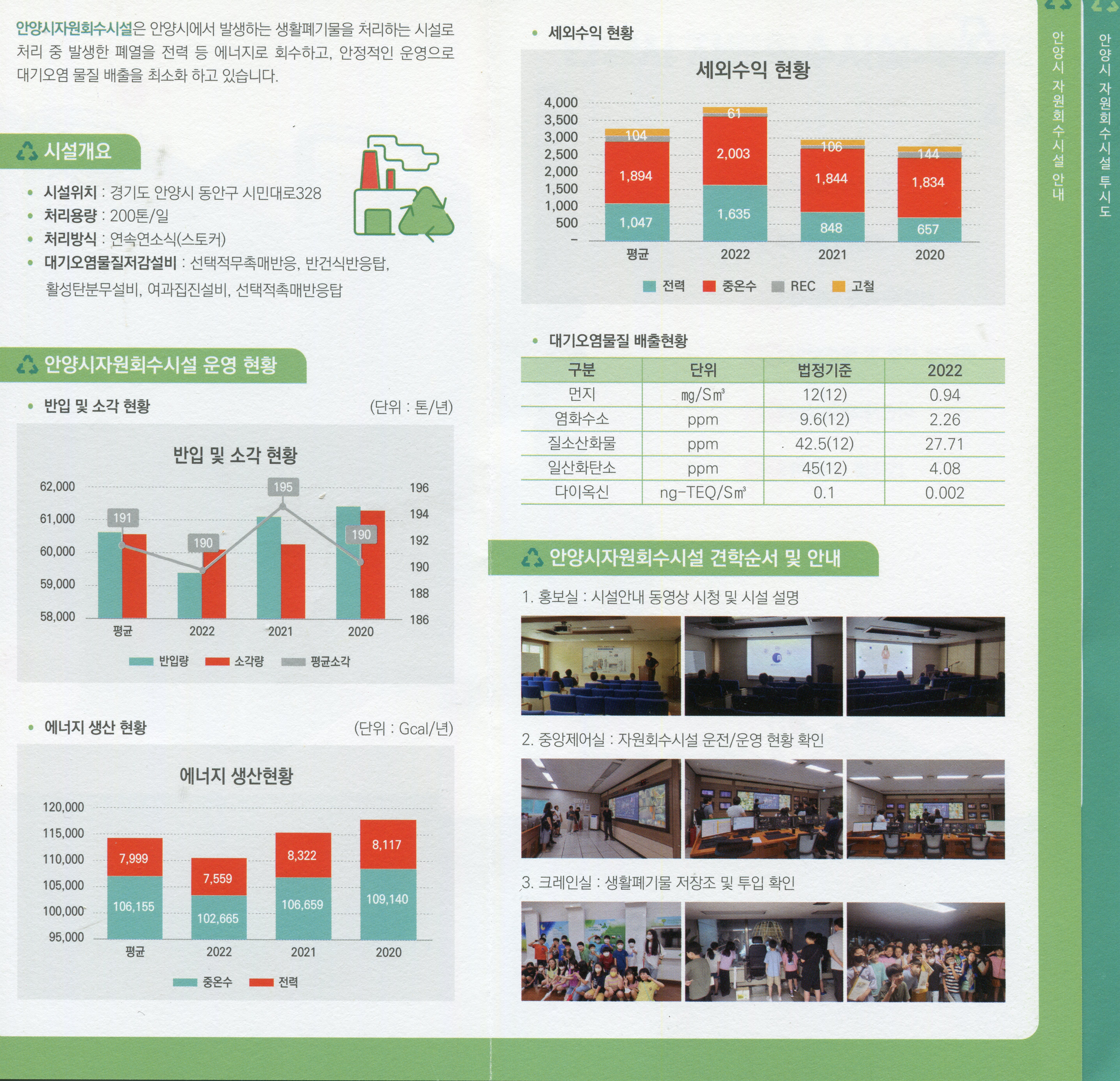특히 안양시 자원회수시설은 일일 생활폐기물 처리량 200톤 규모의 소각시설로 관내에서 발생하는 생활쓰레기를 안정적이고 효율적으로 처리하고 있으며, 소각과정에서 발생하는 폐열 에너지를 이용해 전력과 온수를 생산하고 전력거래소와 인근 지역난방업체에 이를 판매해 연 40억원의 수익을 창출하고 있어 경영합리화에 높은 평가를 받았다.