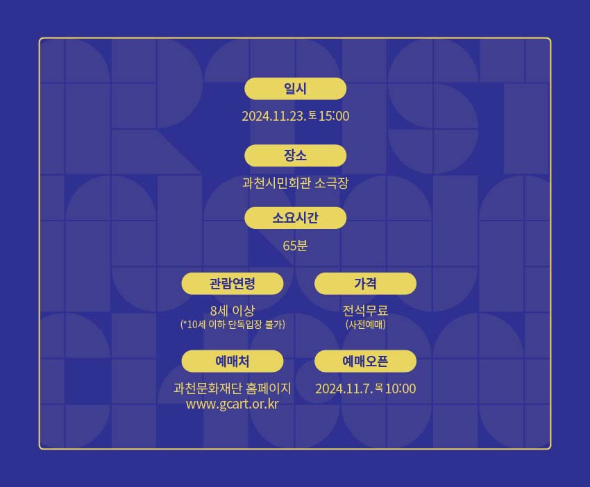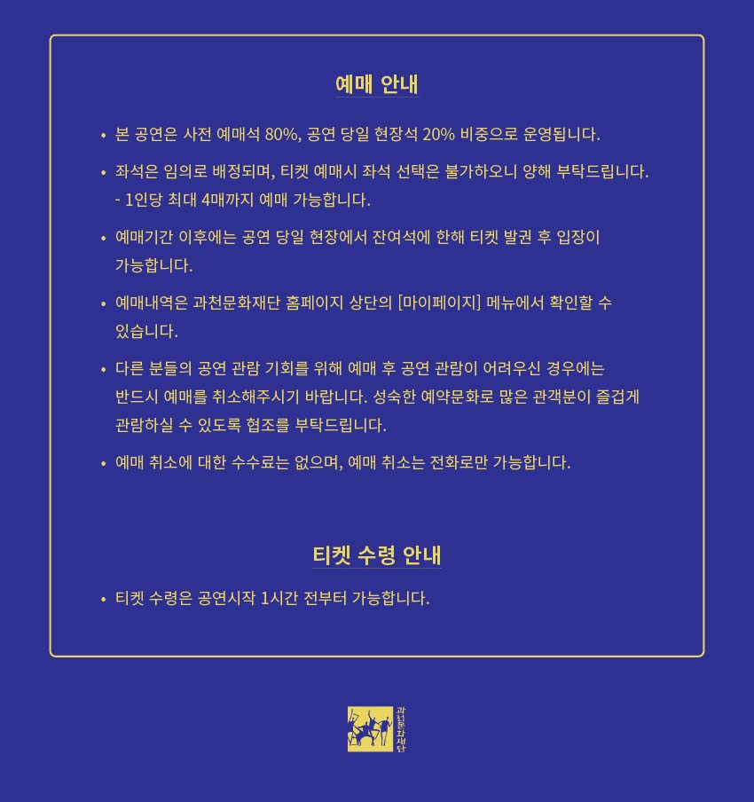 댄스 시어터 ‘행당동 115번지’는‘ 12세 이상 관람가로 과천문화재단 홈페이지에서 예매 가능하며 전석무료이다.