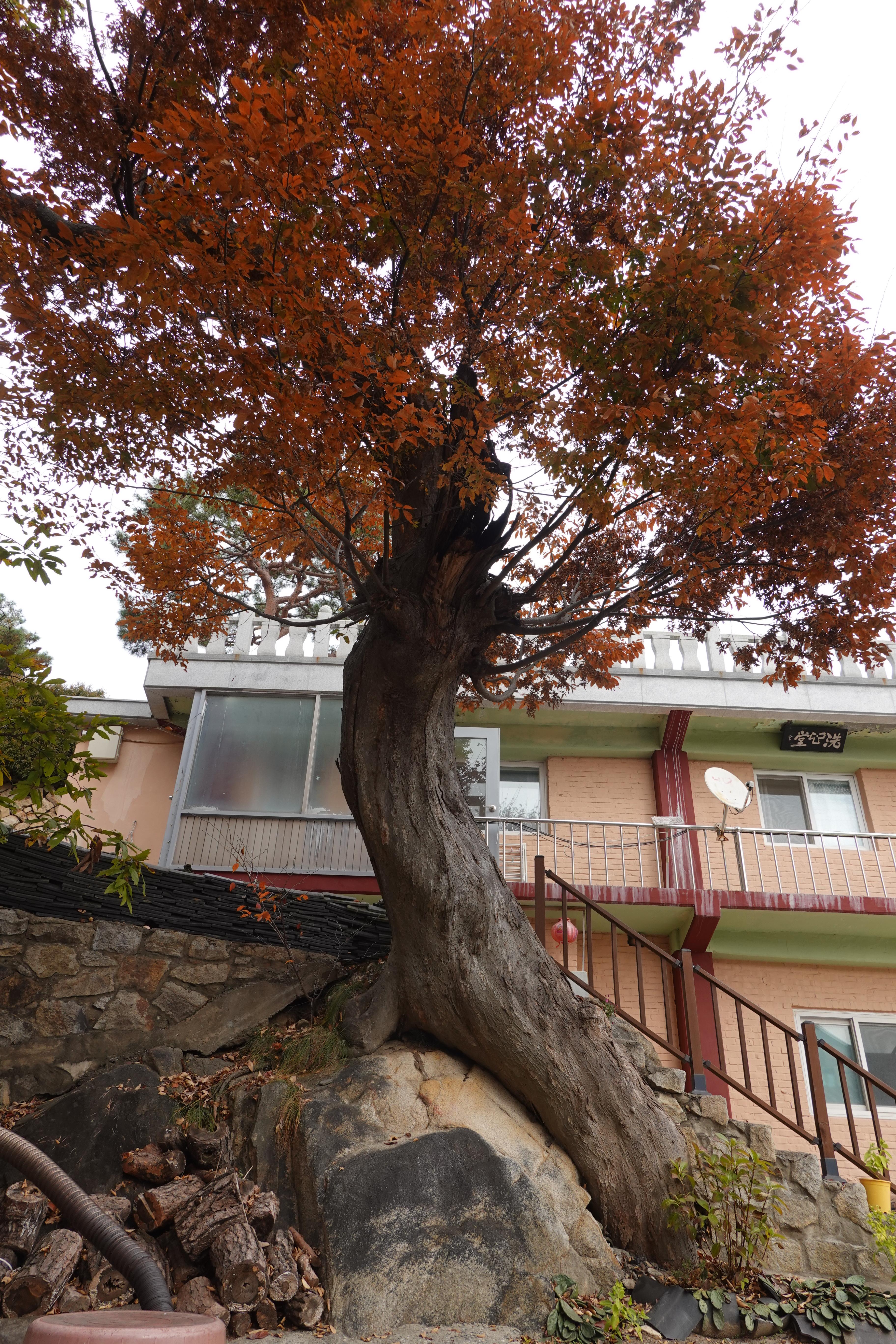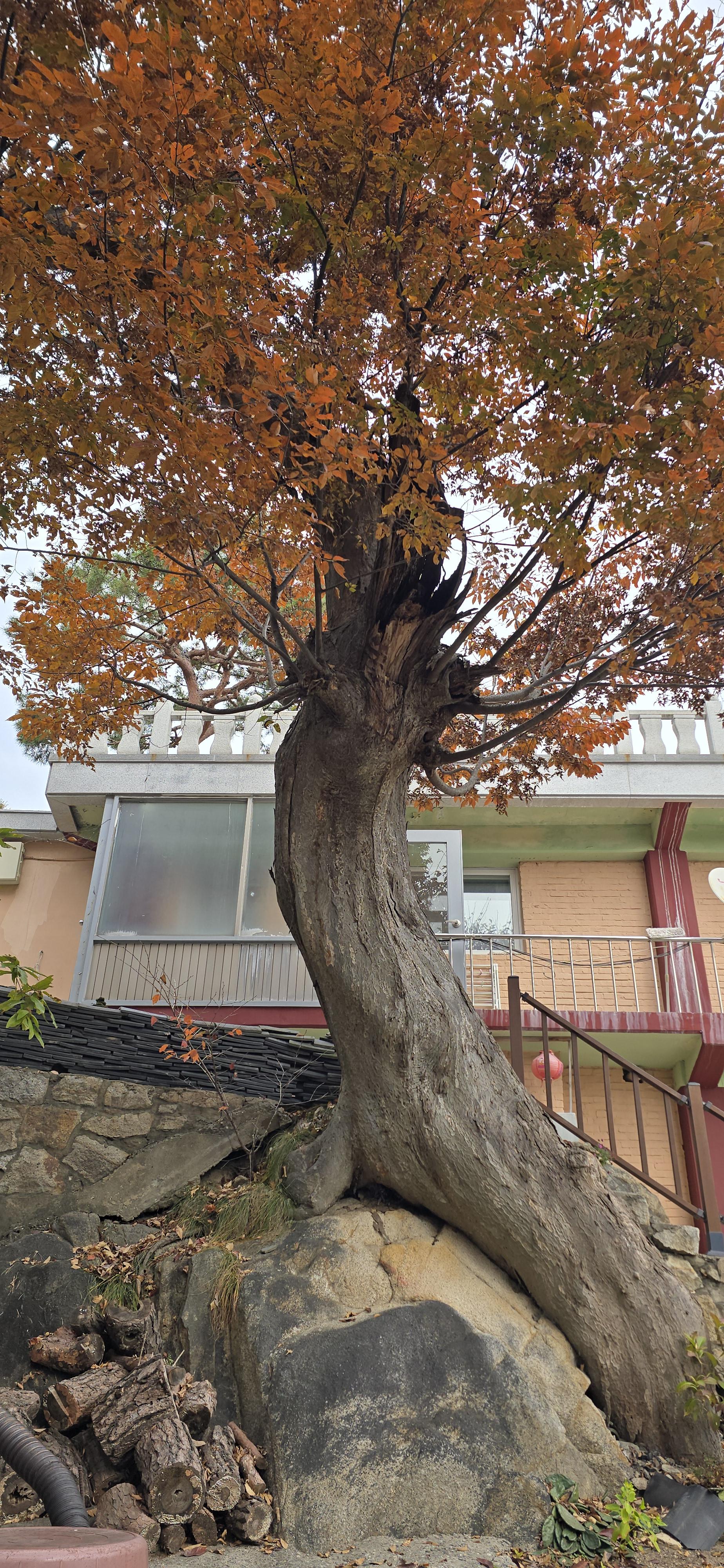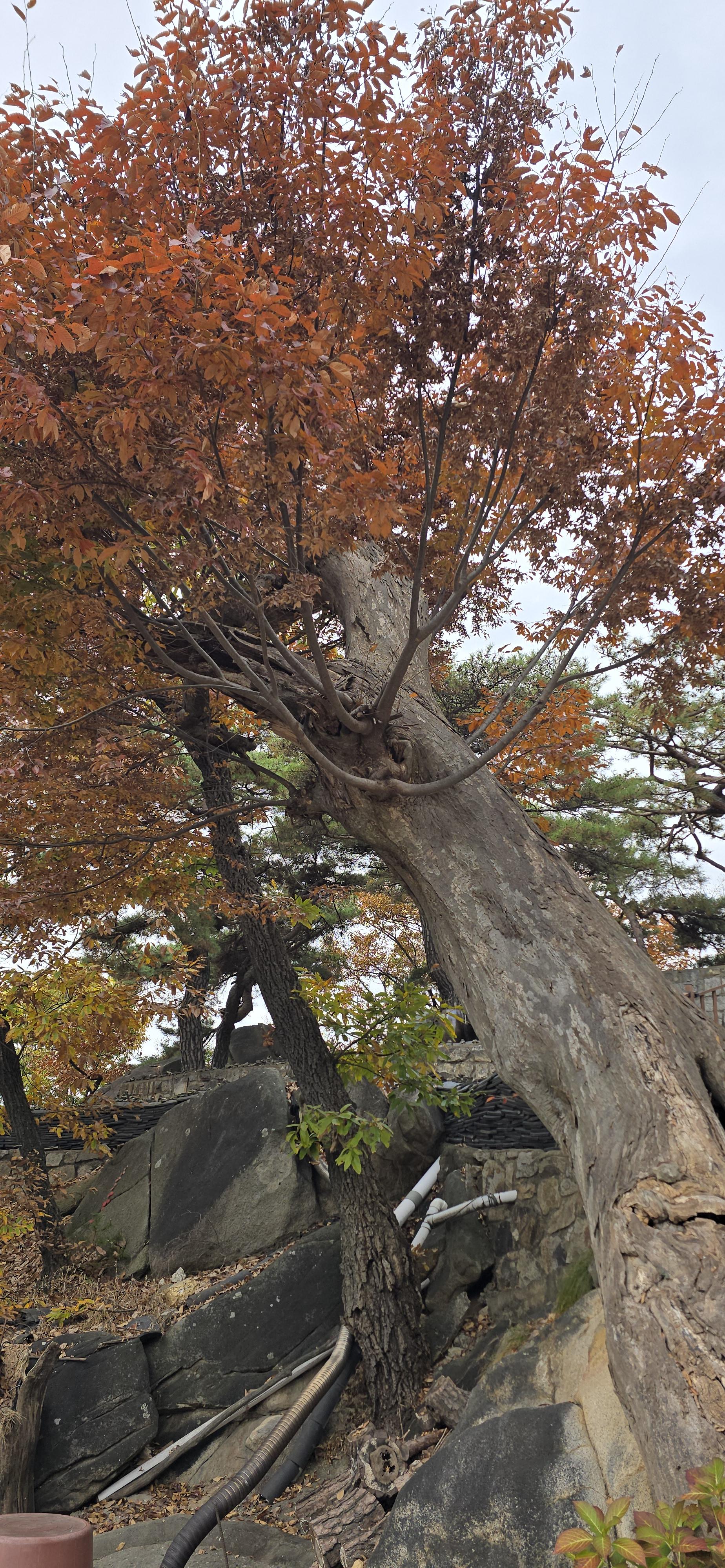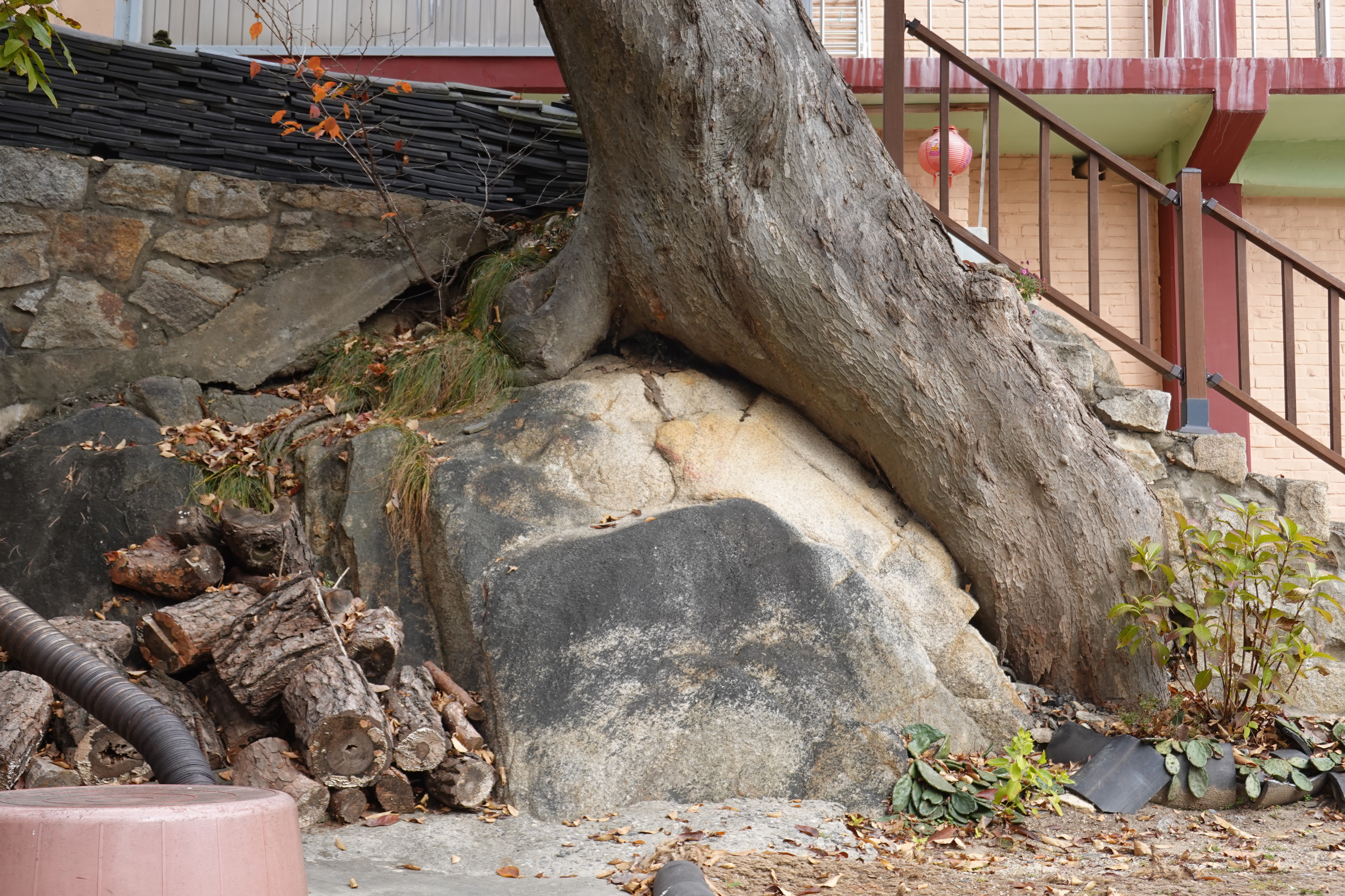 2024.11.24/ #도시기록 #노거수 #안양 #망해암/ 안양 망해암 법당앞 마당에서 칠성각으로 오르는 계단옆에 자리한 노거수 한그루. 나무 밑둥 줄기가 바위를 감싸듯 뚫고 지나서 하늘로 뻗은 모양새가 안쓰럽기만 하다.