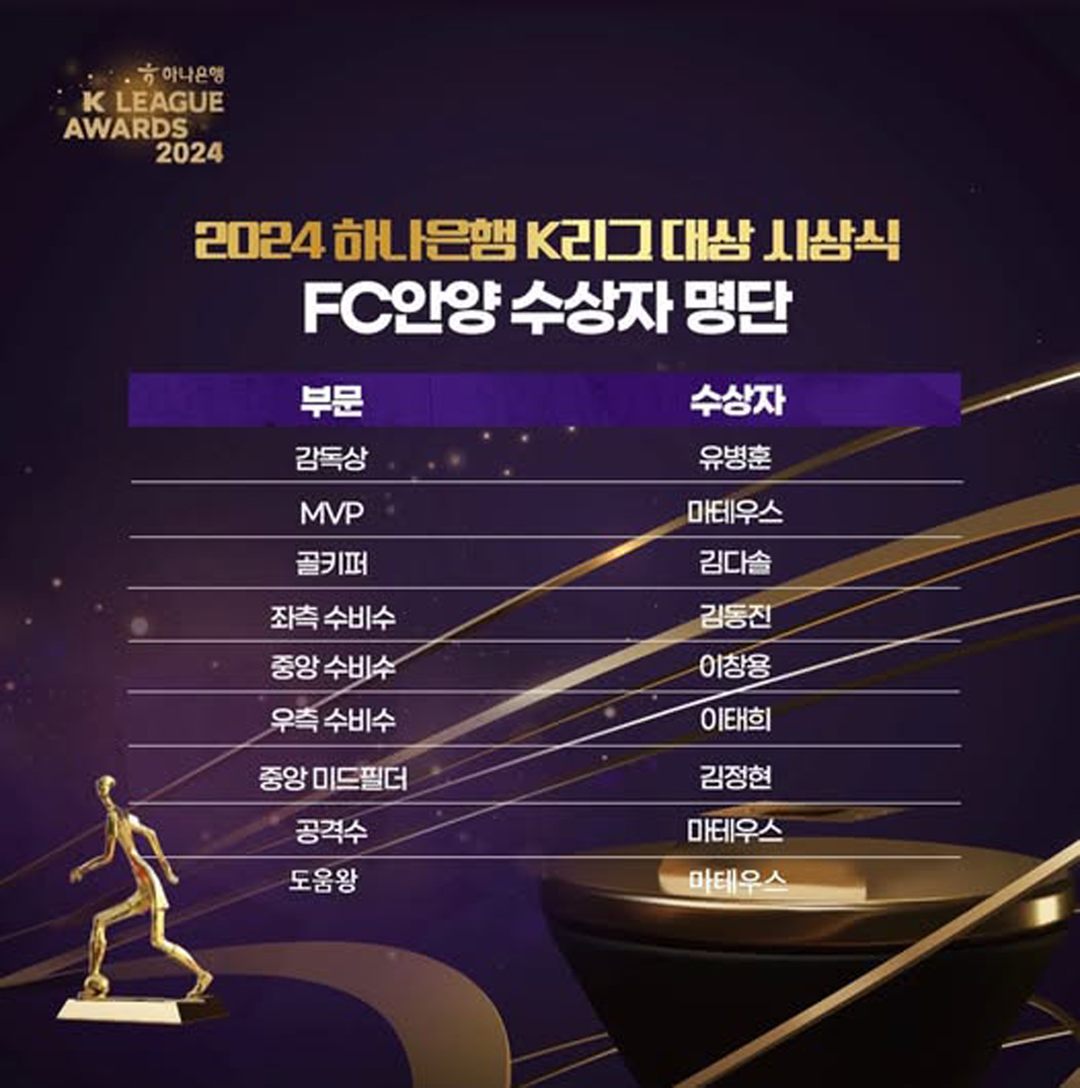 FC안양은 지난 29일 서울 서대문구 스위스 그랜드호텔에서 열린 '하나은행 K리그 2024' 대상 시상식에서 K리그2 감독상과 MVP 외에도 K리그 2 베스트 일레븐중 6명을 배출하고 9개 부문을 차지하며 사실상 상을 싹슬이했다.