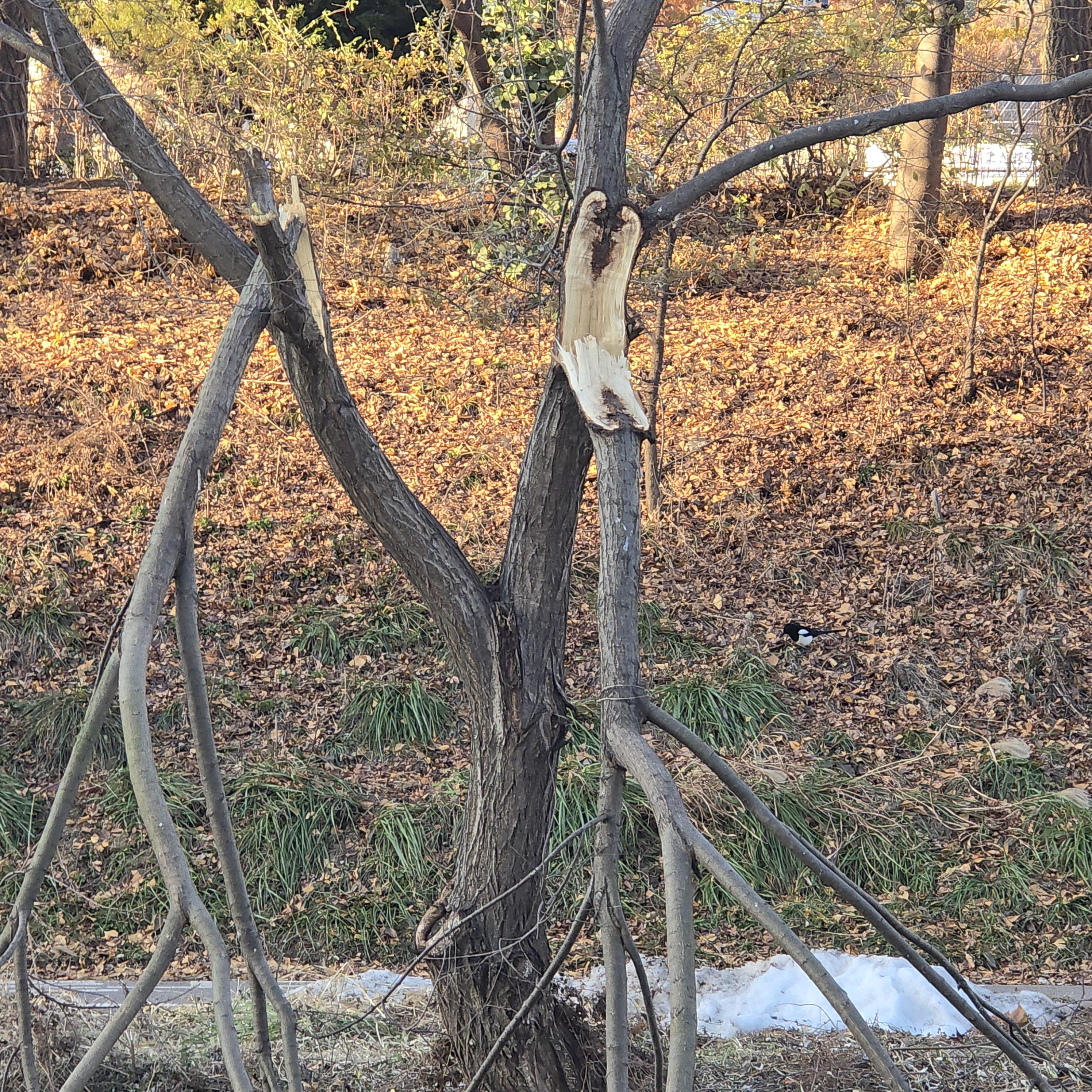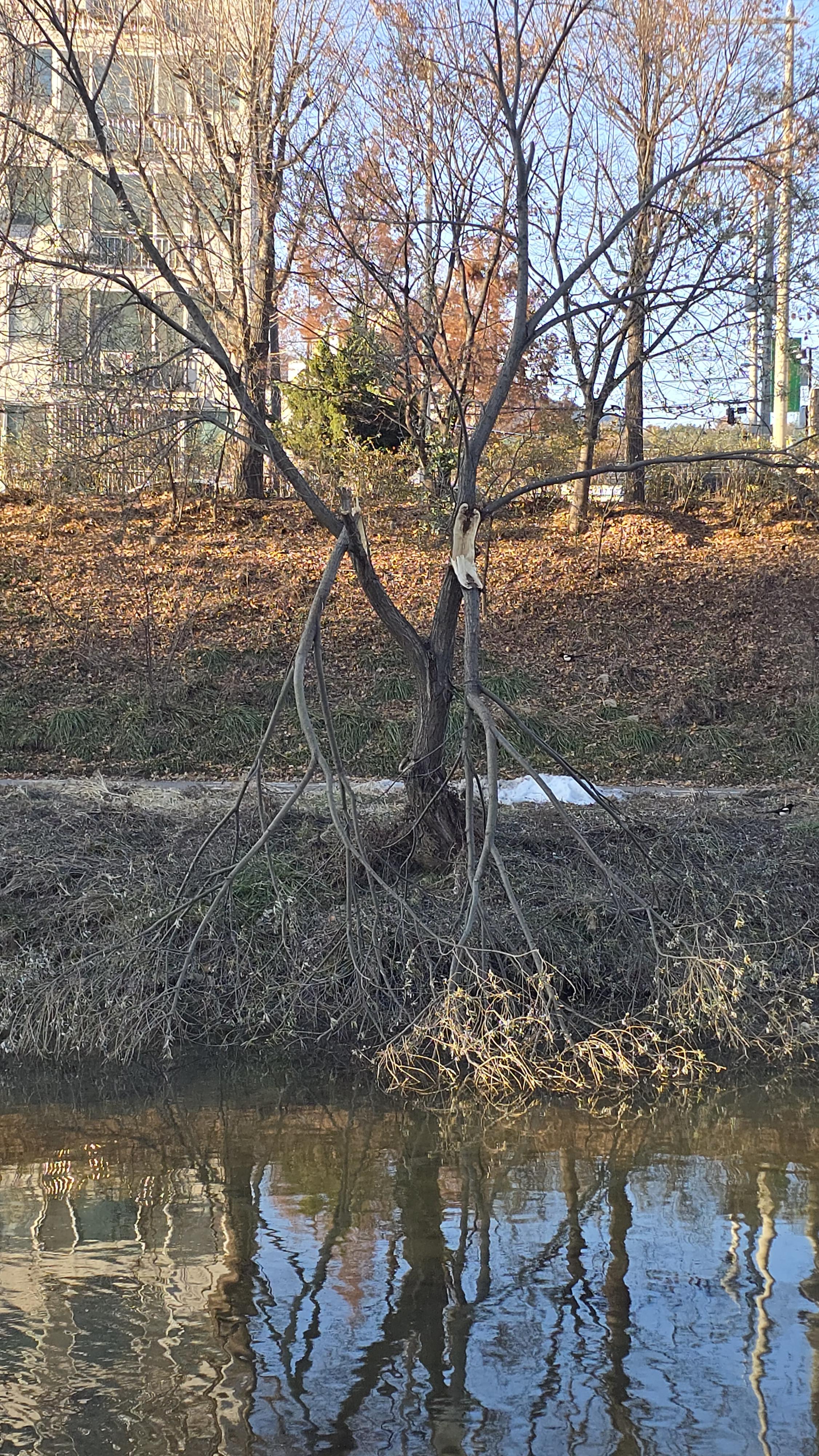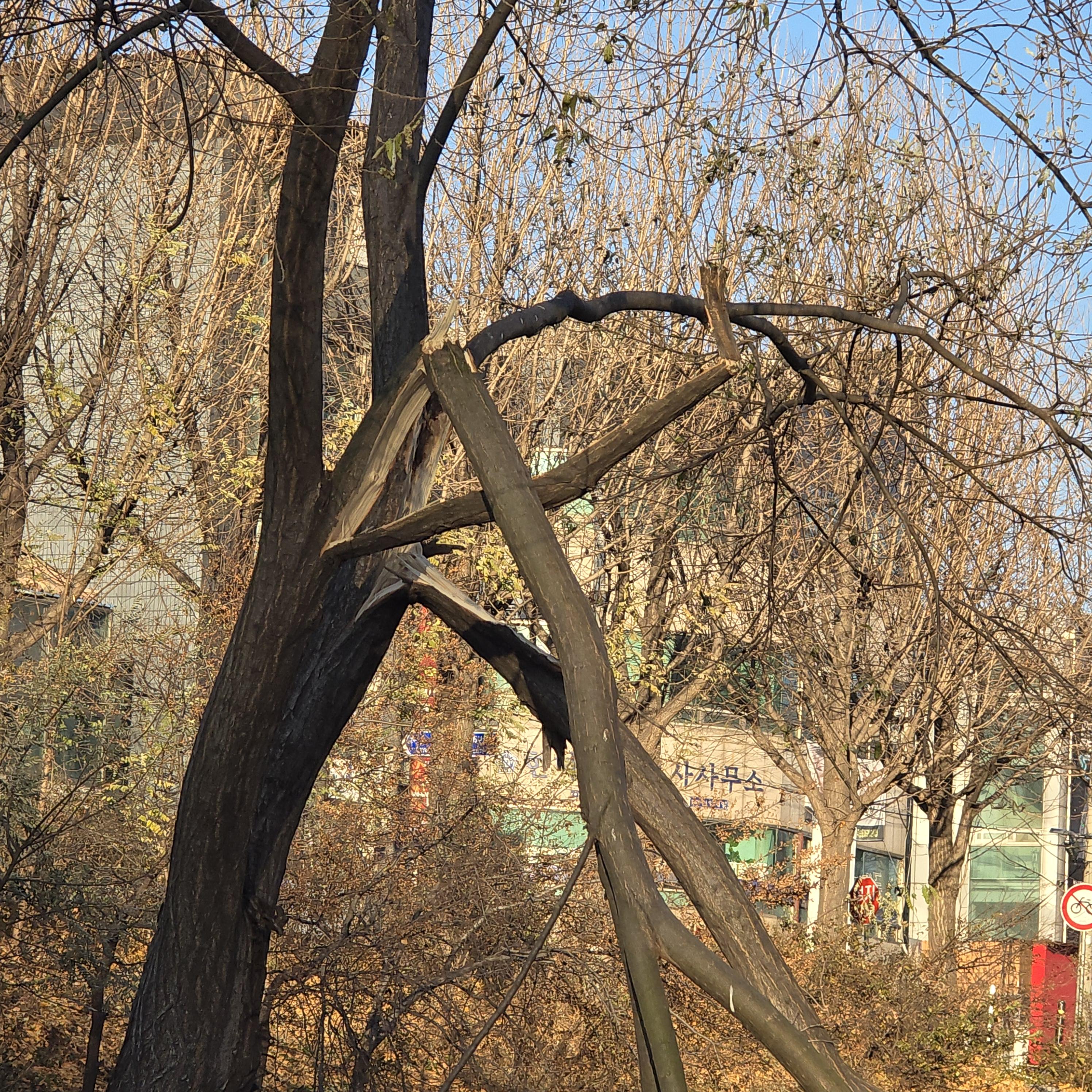 2024.12.08/ #폭설피해 #습설 #안양 #학의천/ 지난 11월 27-28일 이틀 사이 경기중부지역에 내린 50cm에 육박하는 눈 폭탄, 특히 물기를 잔뜩 머금은 습설(濕雪)이 내리면서 공공시설물 붕괴 사고뿐 아니라 도심 공원과 공공기관 정원, 하천변, 근교 산에 심어진 나무들도 눈이 쌓인 무게를 이기지 못해 찟기고, 부러지고 주저앉는 등 큰 피해를 입었다. 오늘 학의천을 걷다보니 곳곳에 피해 흔적이 남아있다.