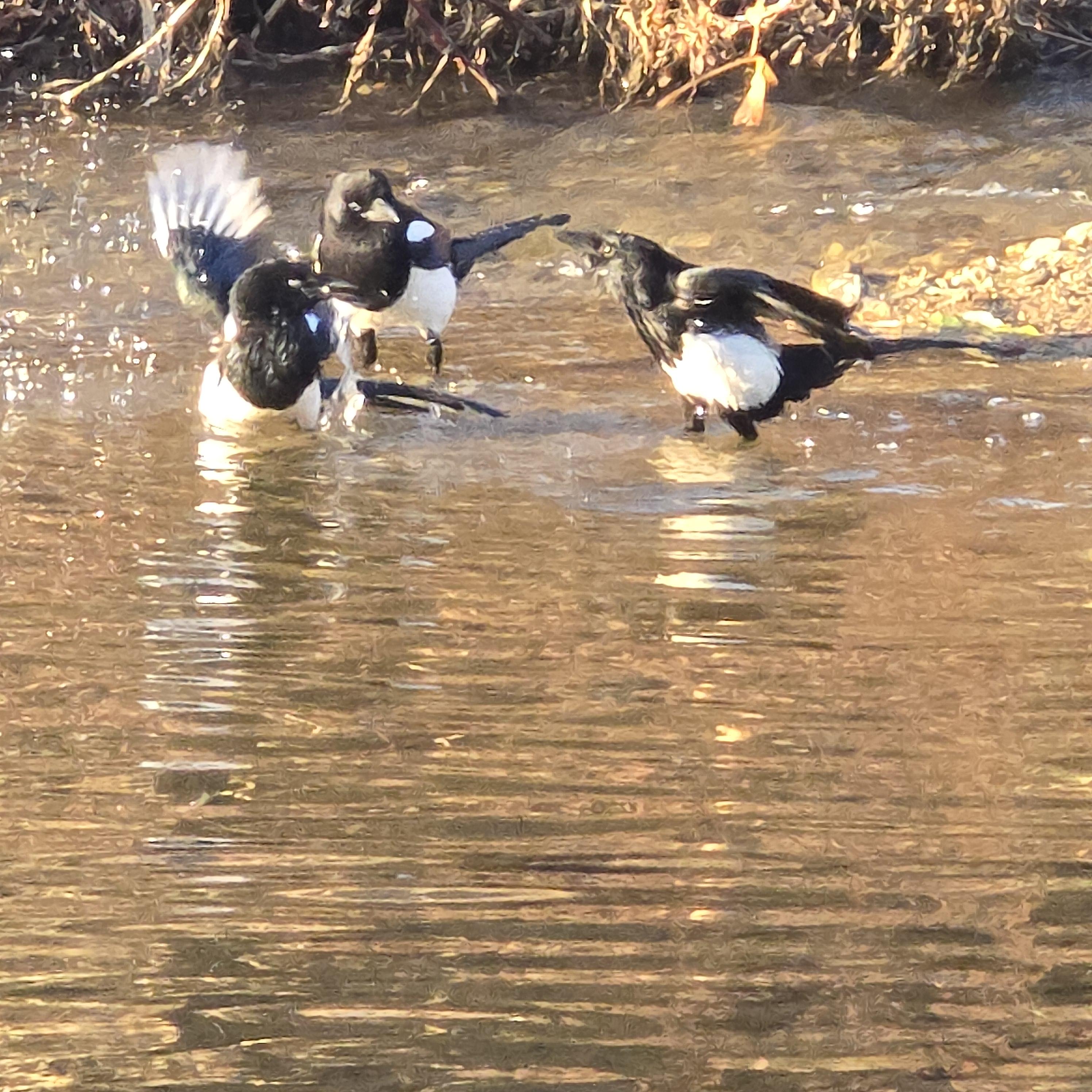 2024.12.08/ #도시기록 #까치목욕 #안양 #학의천/ 안양 학의천 수촌교옆 물가에서 까치들이 목욕 장면을 훔쳐보다.
