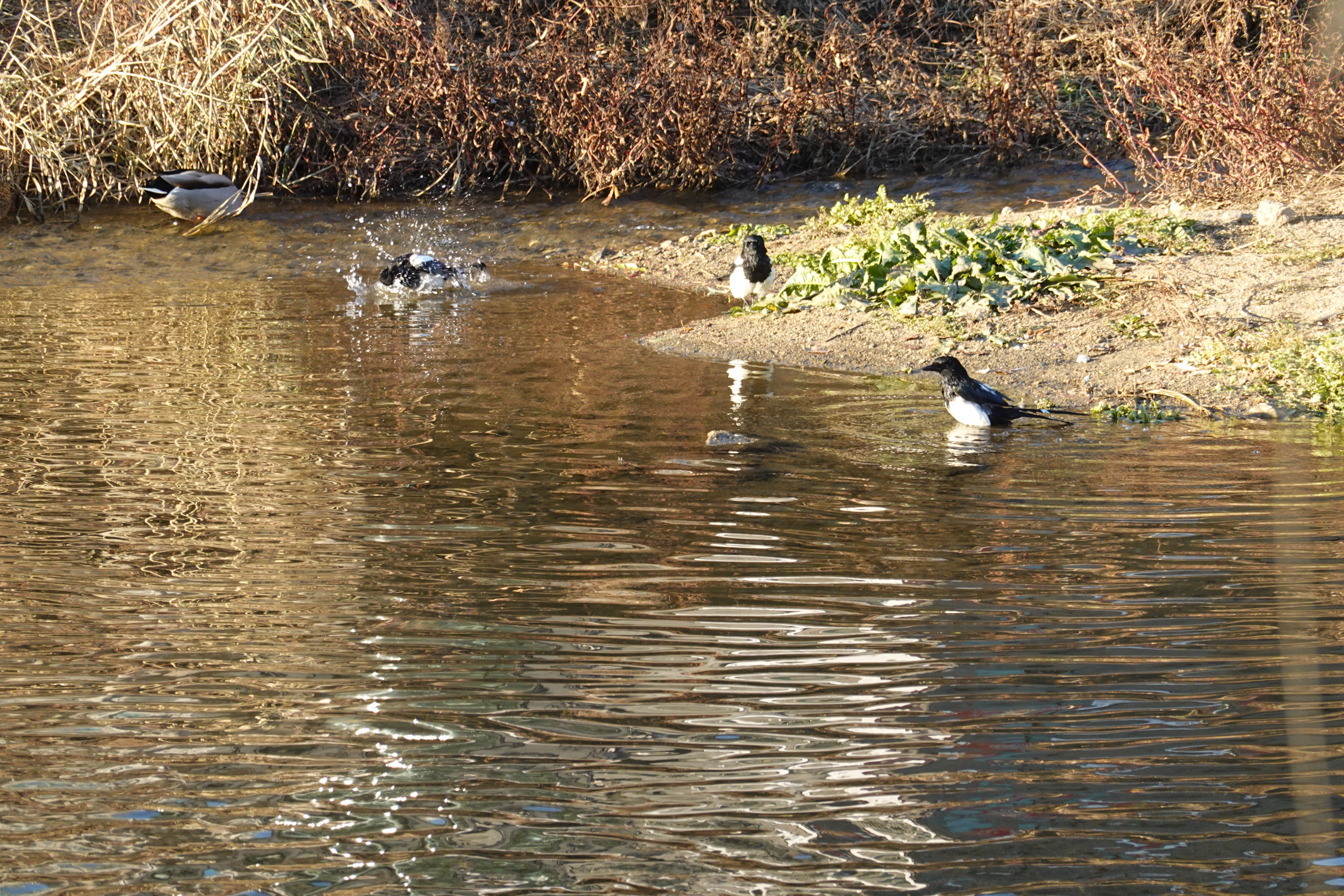 2024.12.08/ #도시기록 #까치목욕 #안양 #학의천/ 안양 학의천 수촌교옆 물가에서 까치들이 목욕 장면을 훔쳐보다.