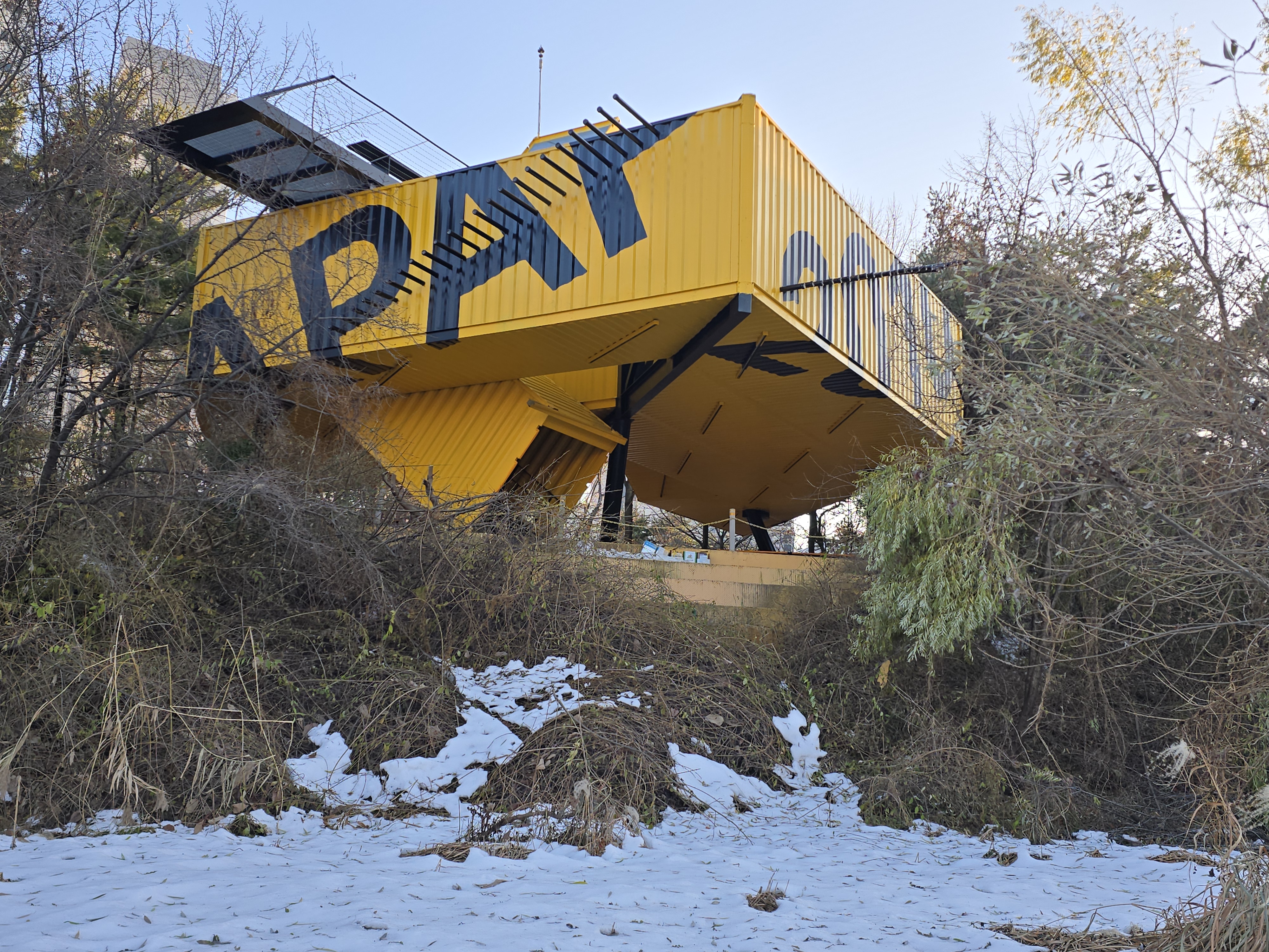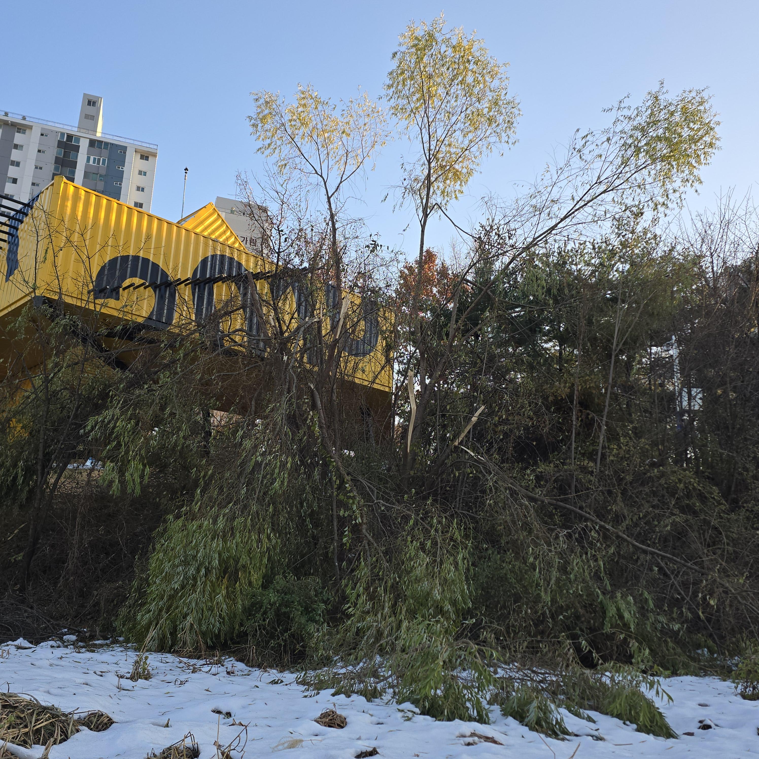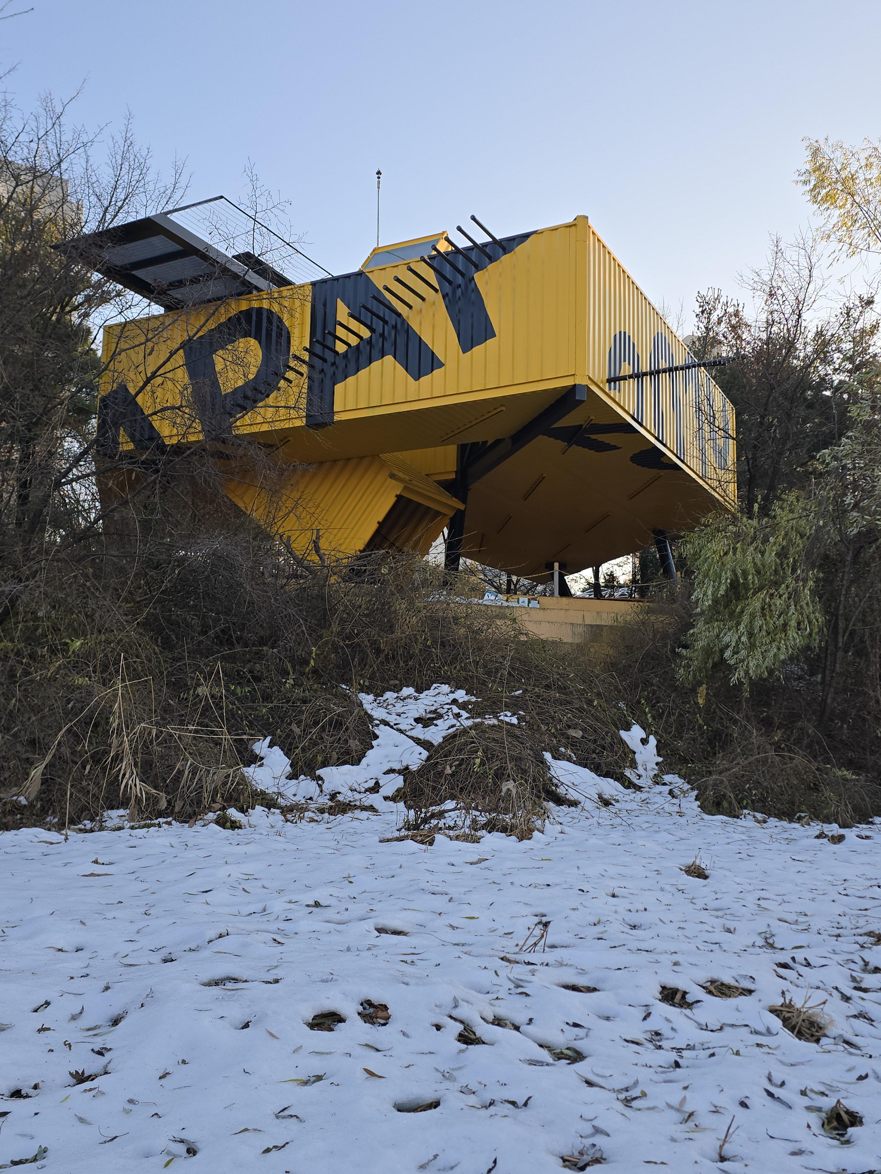 2024.12.08/ #도시기록 #안양 #오픈스쿨 #APAP작품 #학운공원 #페인트칠/ 안양 학운공원 C구역에 자리한 apap2010 영구작품 '오픈스쿨'의 콘테이너 외벽이 페인트칠 보수공사를 통해 깔끔하게 새단장을 했다. 그런데 지나면서 보니 오픈스쿨앞 나무들이 지난 11월 폭설로 찟기고, 가지가 찟기고, 부리지는 등 적지않은 피해를 입었다.