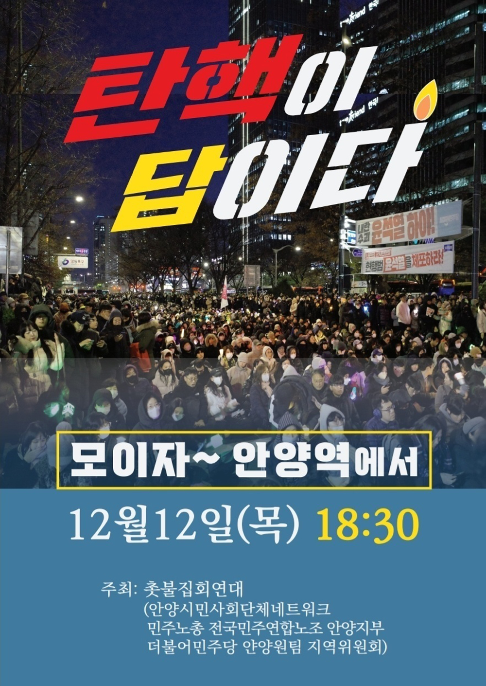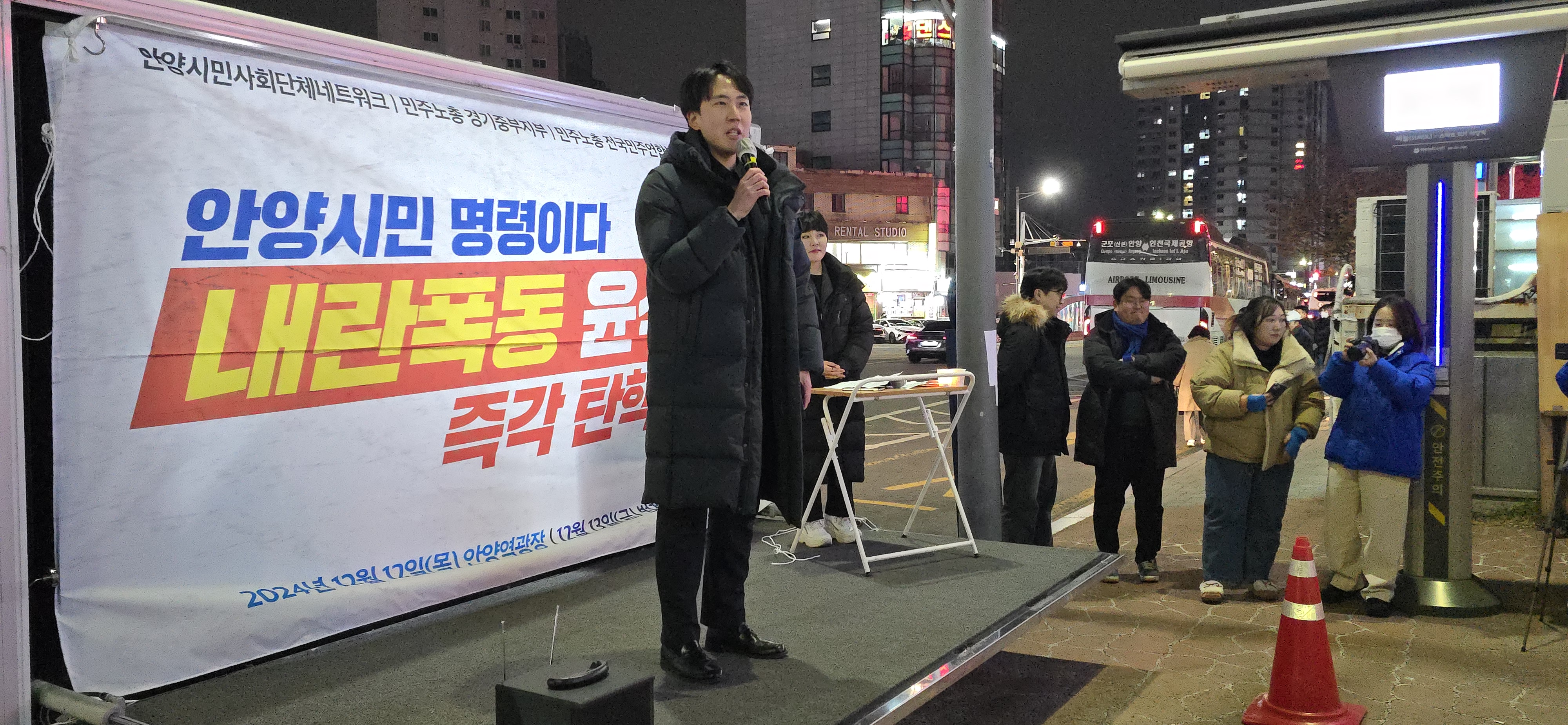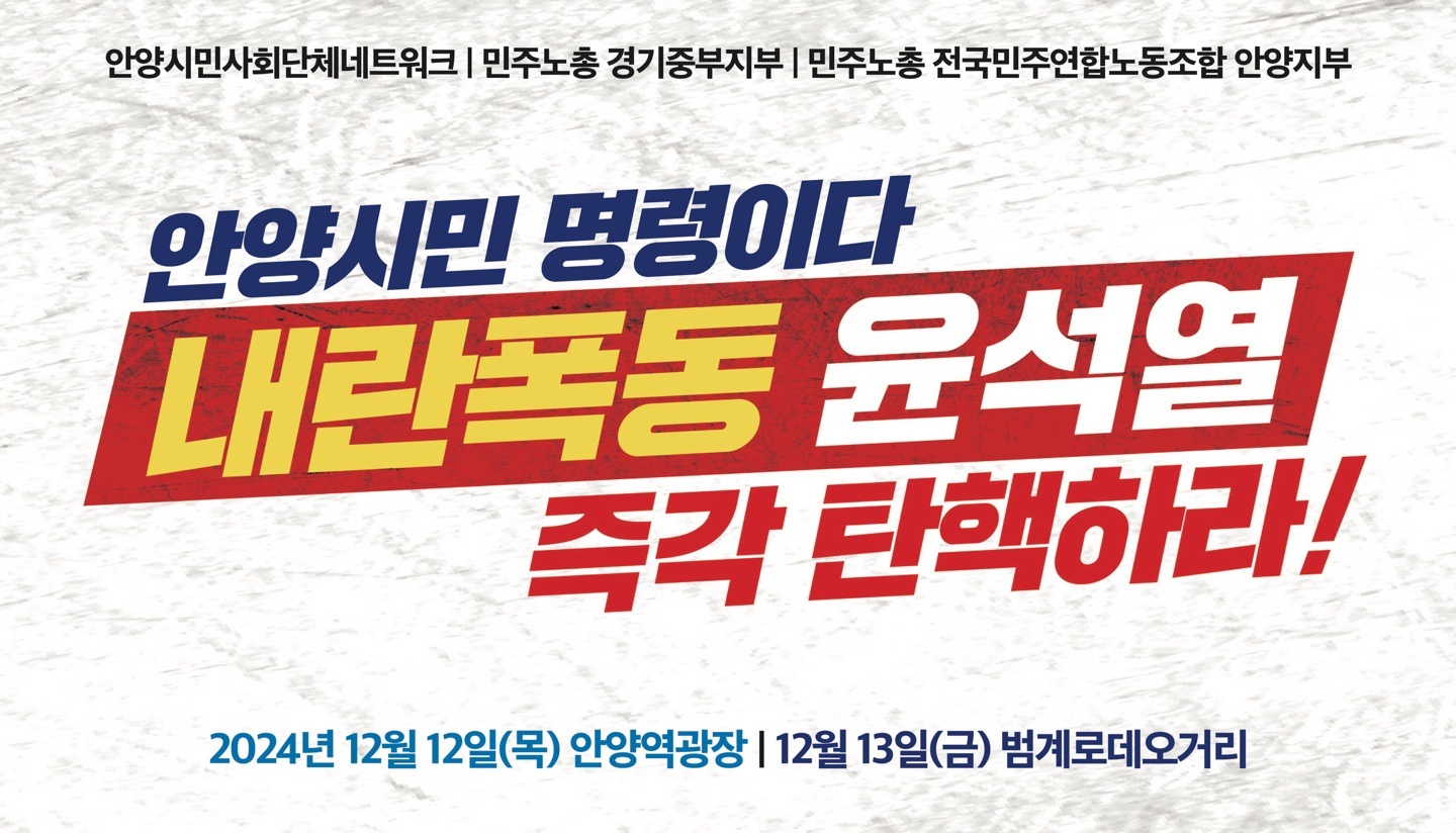 안양시민사회단체 연대체인 안양시민사회단체네트워크와 민주노총경기중부지부, 전국민주연합노조안양지부, 더불어민주당 안양원팀지역위원회 등으로 구성된 안양촛불연대가 주최한 이날 행사는 안양에서 열린 최초의 '윤석열 탄핵 촉구' 집회로 더불어민주당 소속 최대호 안양시장과 강득구 국회의원, 민주당 시·도 의원들도 참여했다.