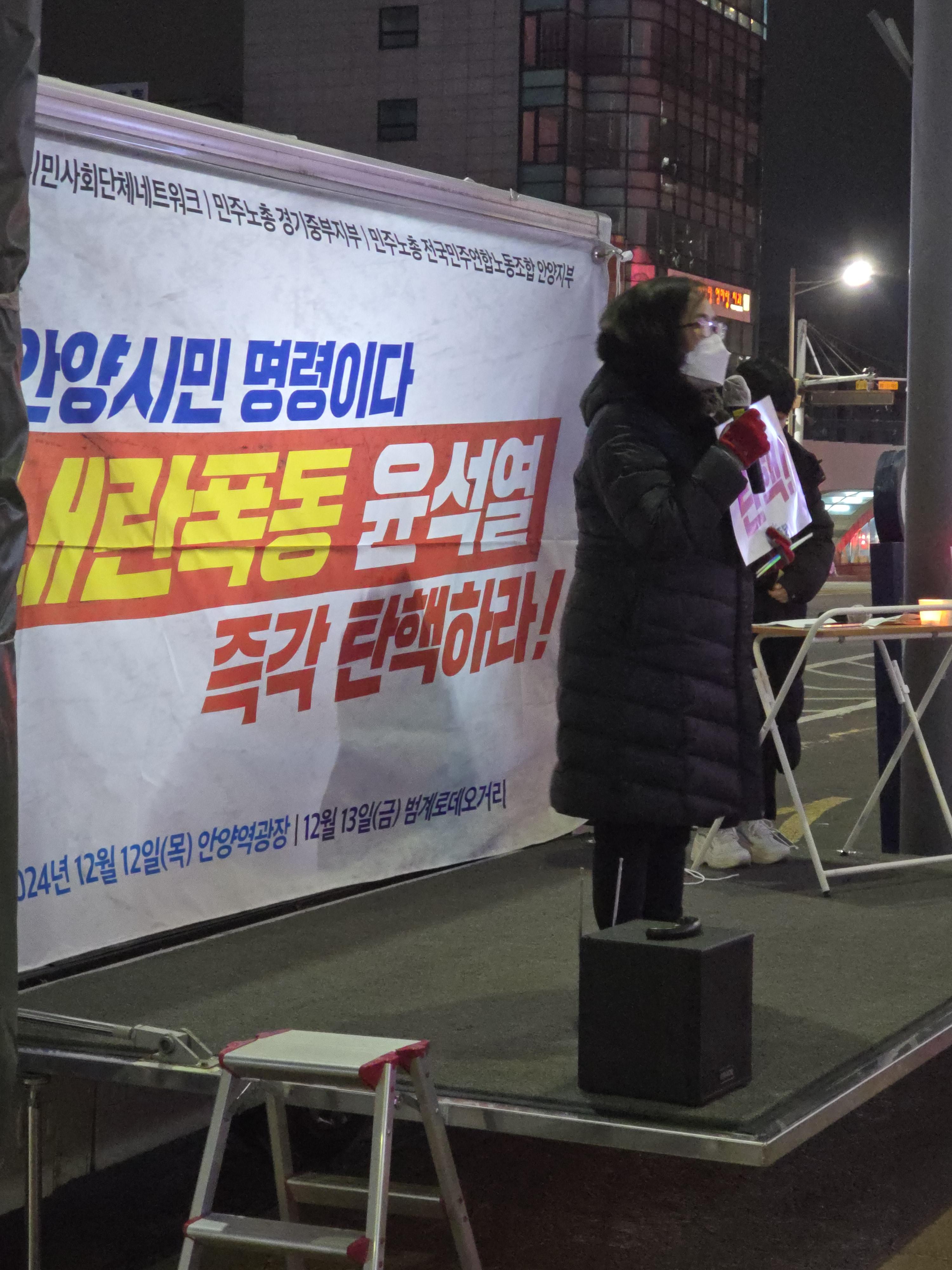 그러면서 "윤석열은 제발 그 입을 다물라"고 목소리를 높인 뒤 "오늘 다진 안양 시민 촛불 기운을 모아 윤석열 정권과 싸워 나가자. 국회에서 탄핵할 수 있도록 힘을 모으자. 내일은 범계역에서, 토요일은 국회 앞에서 촛불을 들자"라면서 발언을 마무리했다.