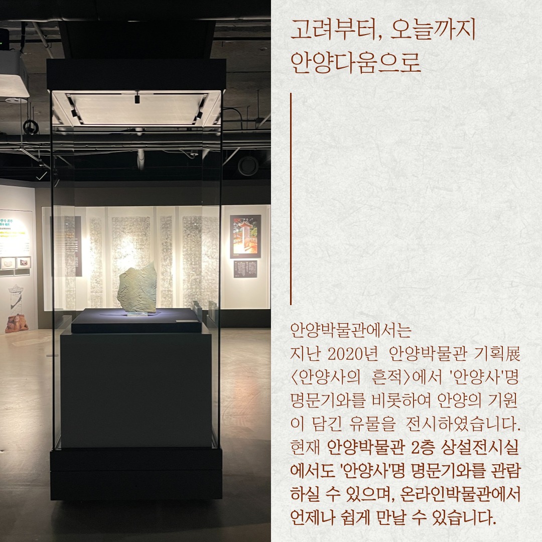 안양의 첫 시작을 문자로 확인 할 수 있는 유물이자, 고려시대부터 안양이 중요한 장소였음을 알려주는 중요한 자산입니다.