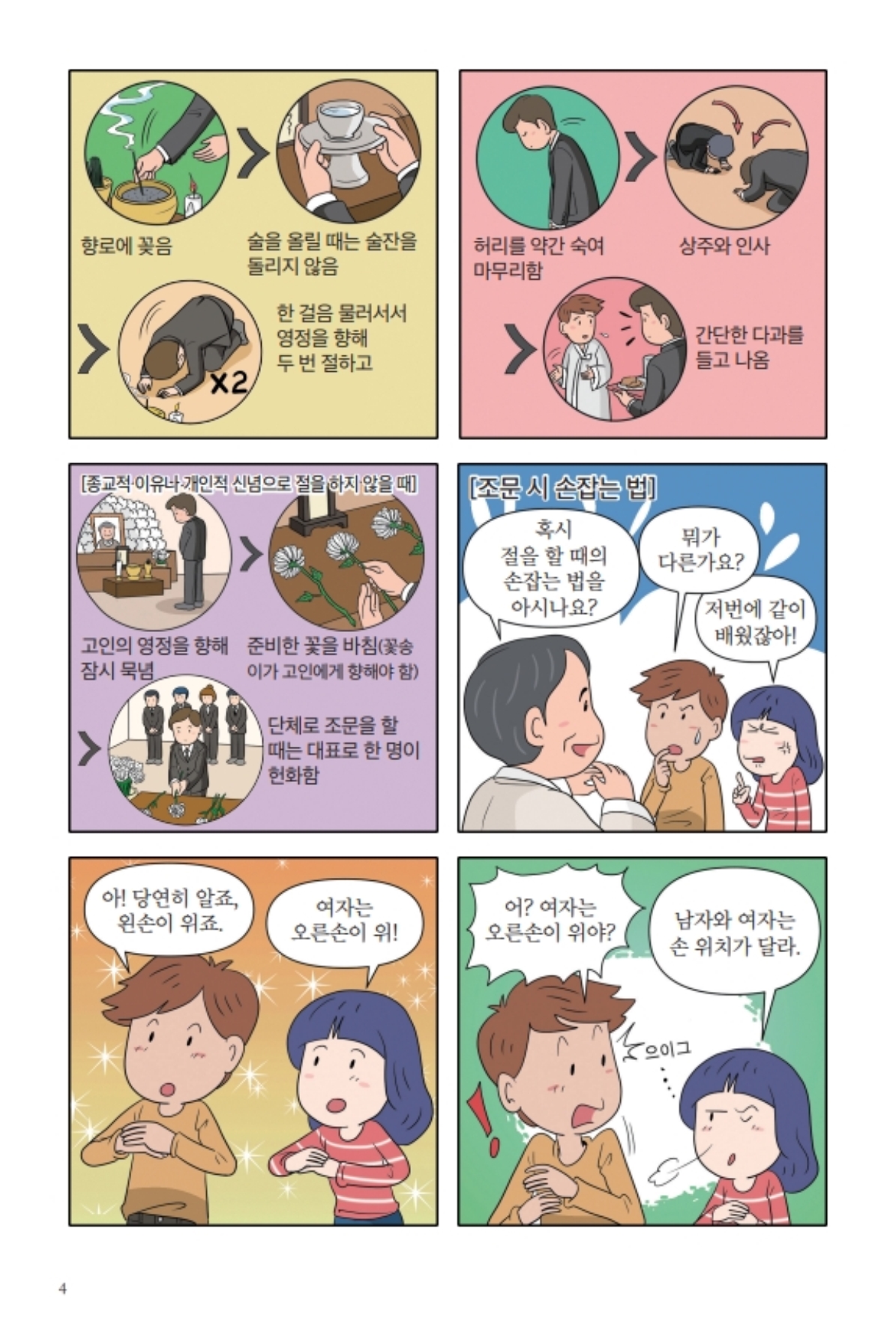 조문객 예절에 대해서는 "고인에게 두 번 절하고 상주에게 인사한 다음 유족 슬픔을 이해하는 모습만 보이면 된다"며 "상주에게 따뜻하고 진지한 위로 한마디 정도를 건네는 것도 좋다. 상황에 따라 아무 말도 하지 않고 물러나는 것도 좋은 방법"이라고 밝혔다.