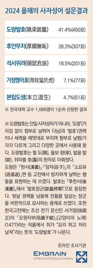 교수신문이 전국 대학교수 1086명에게 설문조사를 실시한 결과 2024년 올해의 사자성어에 '제멋대로 권력을 부리며 함부로 날뛰다'는 뜻의 '도량발호(跳梁跋扈)'가 선정되었다.\