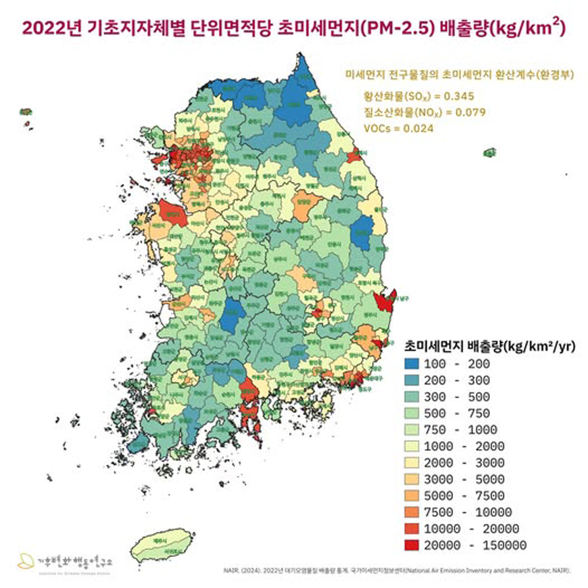 2022년 기초지자체별 단위면적당 초미세먼지(PM-2.5) 배출량(kg/km²)]