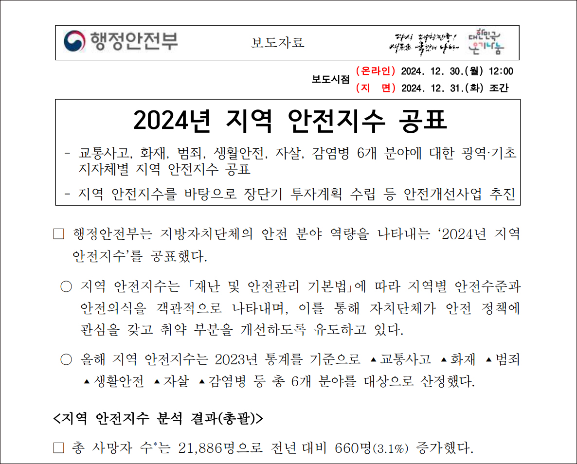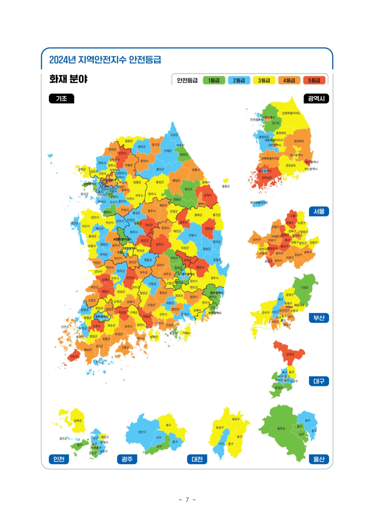 올해 지역 안전지수는 2023년 통계를 기준으로 교통사고, 화재, 범죄, 생활안전, 자살, 감염병 등 6개 분야에서 상위 0~10%인 1등급부터 5등급까지 산정해 30일 공개했다.