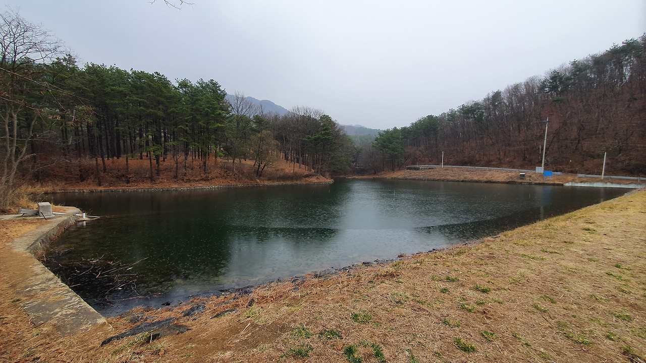 뚝방위에 올라서면 아담한 저수지 전체가 보인다. 왼쪽 게곡에서 내려오눈 맑은 물이 저수지 물을 채우고 저수지에서 홀러내린 물이 오전천으로 흘러든다.