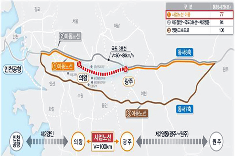 이번 고속도로는 민간투자사업으로 진행되며, 제2차 국가도로망 종합계획에서 국가간선도로망 동서8축의 단절구간(의왕~광주)을 연결하는 핵심 사업이다. 완공되면 인천공항에서 강원 원주(강릉)까지 이어지는 국가기간망이 완성돼 수도권과 강원권을 오가는 교통이 한층 편리해질 전망이다.