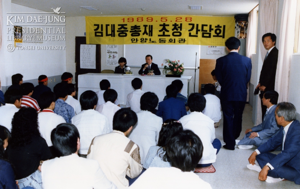 안타깝게도 노벨평화상기념관 사진 기록에 촬영일자가 없다. 이석현 전 의원에게 확인을 요청했다니 1990년 4월20일로 추정된다고 전해왔다. 하지만 안양노동회관 노조간담회 사진속 현수막에는 1989년 5월28일로 표기돼 있다.